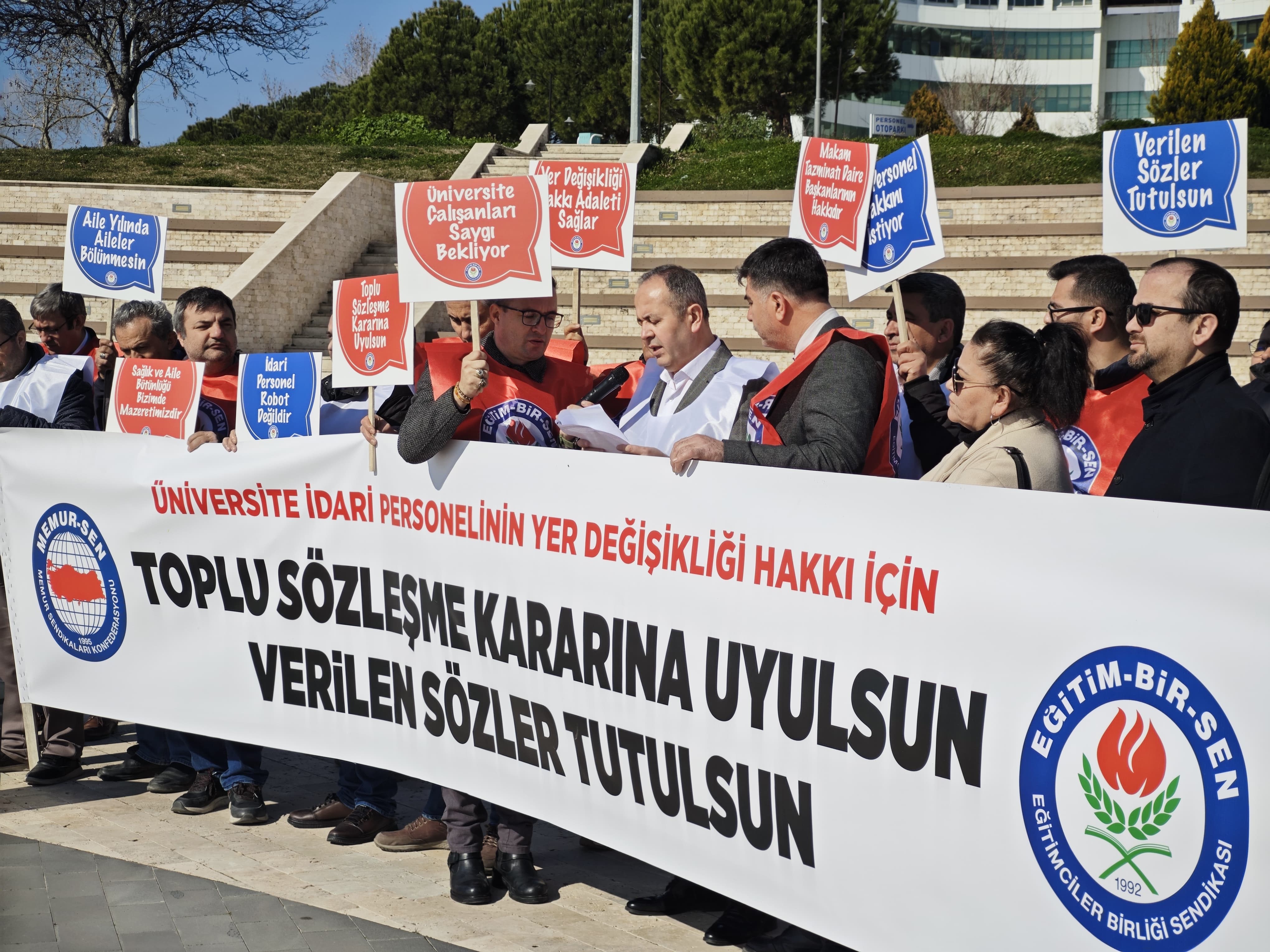 Devlet Memurları Kanunundaki tüm haklara sahip olan üniversitelerin idari personelinin yer değişikliği hakkının olmadığını ve mağduriyetin giderilmesi için bir araya geldiklerini anlatan Eğitim Bir Sen Manisa 2 Nolu Şube Başkanı Bilal Elbir, "657 sayılı Devlet Memurları Kanunu’na tabi olarak istihdam edilen üniversite idari personeli, kadro ve pozisyon unvanları itibarıyla her bir üniversitede aynı yeterliliğe sahip olarak aynı işi yapmalarına rağmen bakanlık ve taşra teşkilatı bulunan diğer merkezî kamu kurum ve kuruluşlarında çalışan idari personelin iller arasında/kurumlar arasında yer değişikliğine benzer bir merkezî yer değişikliği hakkında sahip değildir. Üniversite idari personelinin bir diğer üniversiteye yer değişikliği yapabilmesi, kadrosunun bulunduğu üniversitenin muvafakatine bağlıdır. Bu muvafakatin verilmemesi uzun dava süreçlerine neden olmakta; çoğu durumda yer değişikliği yapılmak istenen üniversite, personel ihtiyacı için beklemek zorunda olmadığı için lehe sonuçlanan muvafakat davaları dahi sonuç doğuramamaktadır. Hâlihazırda çoğu üniversite, diğer üniversitelere yer değişikliği yapmak isteyen idari personelinin bu taleplerini yönergeler aracılığıyla düzenlemektedir. Bu yönergelerde, yer değişikliği yapmak isteyen idari personel için asgari görev yapma süresi, kadro unvanı/hizmet sınıfı bazında kontenjan, geçerli mazeret vb. şartlar aranmaktadır. Ancak bu yönergelerin yeknesak olmadığı ve uygulama birliği sağlanamadığı gibi diğer üniversiteleri bağlayıcı hükümler tesis edemediği açıktır. 2547 sayılı Yükseköğretim Kanunu’nun 52. maddesinin (f) bendindeki ‘üniversitelerde görevli memur ve diğer görevlilerin Yükseköğretim Kurulu Başkanı tarafından yükseköğretim üst kuruluşları veya yükseköğretim kurumları arasında atanabilecekleri’ hükmü, üniversite idari personelinin üniversiteler arasında yer değişikliğinin hukuki dayanağının mevcut olduğunu ortaya koymaktadır." dedi.