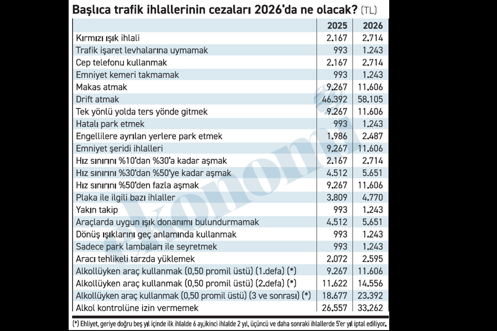 "Trafik cezaları 2026 yılında bu yıla göre yaklaşık yüzde 25,25 oranında artırılacak. Artış en az yüzde 25, en fazla yüzde 25,50 dolayında olur; tabloda yer alan 2026’ya ilişkin tutarlar da artı-eksi yüzde 0,2 dolayında değişiklik gösterir.