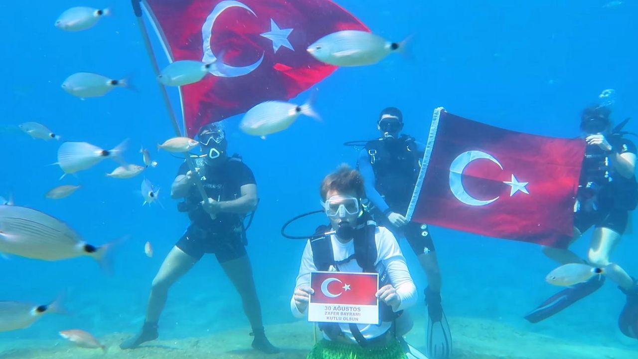 30 Ağustos Zafer Bayramı dolayısı ile Fethiye'de anlamlı bir etkinlik düzenlendi. Fethiyeli dalgıçlar Dalyan Koyu'nda 8 metre derinlikte Türk Bayrağı açarak dalgalandırdı. Dalgıçlar Önder Diktaş, Barış Safran, Berkay Çetin, Ersu Mengi, İbrahim Tombak, Burkay Kayıran ve Can Aksoy deniz dibinde açtıkları bayrakla poz verdi. O anlar ise su altında kameralara yansırken balıklarda görüntüye eşlik etti.