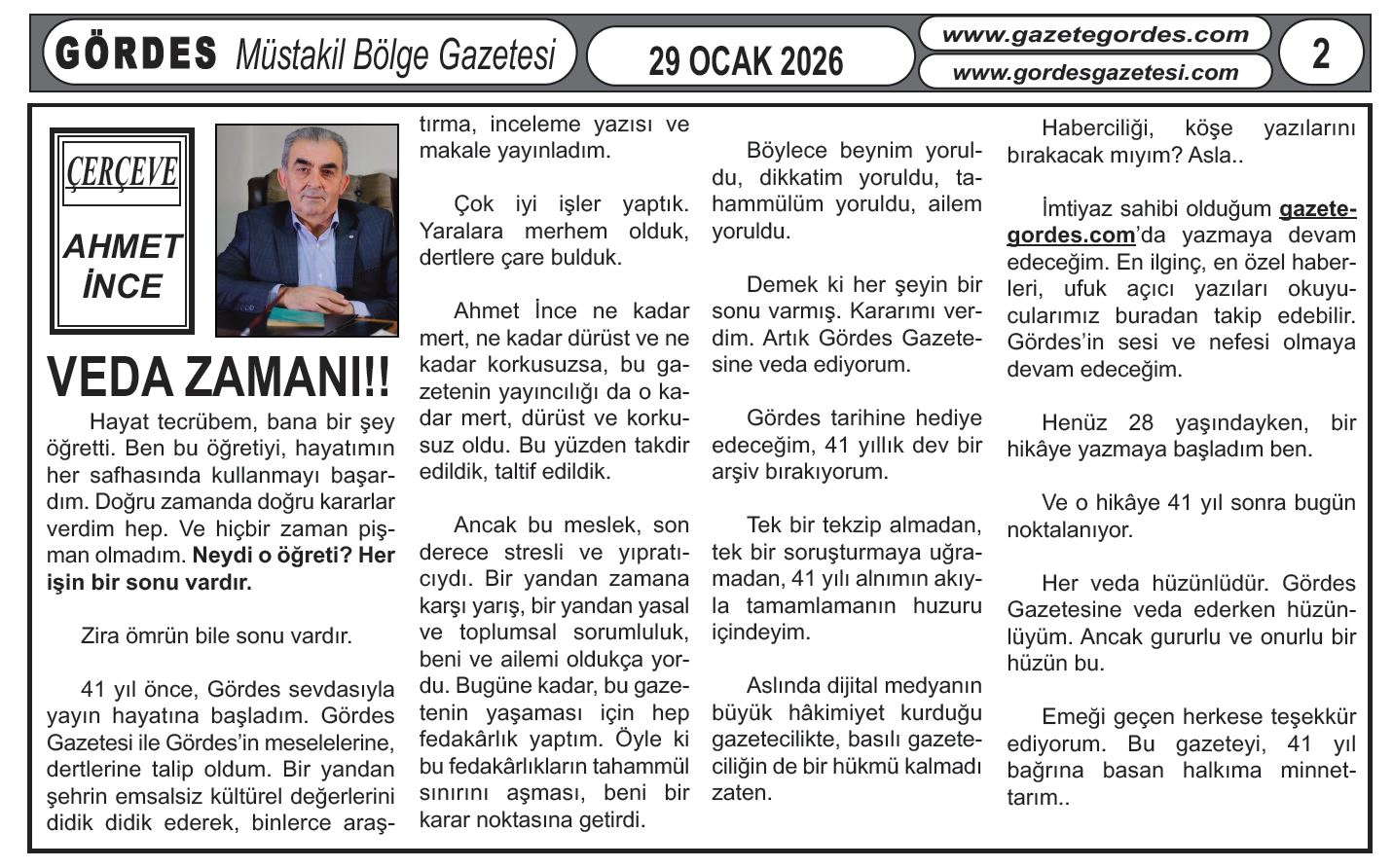 Yazmaya ve haberciliğe imtiyaz sahibi olduğu gazetegordes.com sitesinden devam edeceğini duyuran İnce, “41 yıl önce, Gördes sevdasıyla yayın hayatına başladım. Gördes Gazetesi ile Gördes’in meselelerine, dertlerine talip oldum. Bir yandan şehrin emsalsiz kültürel değerlerini didik didik ederek, binlerce araştırma, inceleme yazısı ve makale yayınladım. Ancak bu meslek, son derece stresli ve yıpratıcıydı. Bir yandan zamana karşı yarış, bir yandan yasal ve toplumsal sorumluluk, beni ve ailemi oldukça yordu. Bugüne kadar, bu gazetenin yaşaması için hep fedakârlık yaptım. Öyle ki bu fedakarlıkların tahammül sınırını aşması, beni bir karar noktasına getirdi. Böylece beynim yoruldu, dikkatim yoruldu, tahammülüm yoruldu, ailem yoruldu. Demek ki her şeyin bir sonu varmış. Kararımı verdim. Artık Gördes Gazetesine veda ediyorum. Gördes tarihine hediye edeceğim, 41 yıllık dev bir arşiv bırakıyorum.” şeklinde yazdı.
