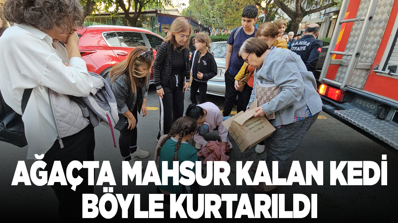 Gençler aşağıda çarşaf açarken itfaiye ise kediyi ağaçtan indirmek için titiz bir çalışma yaptı.