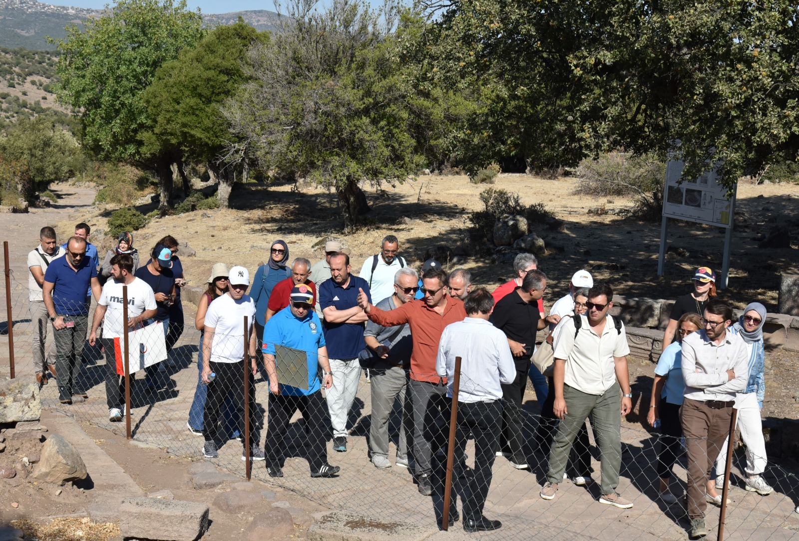 Katılımcılara antik kent hakkında bilgi veren Aigai Antik kentiKazı Başkanı Prof. Dr. Yusuf Sezgin, "Antik kalıntılar aslında tepenin üstünde. Farkındaysanız tepenin iki yanından iki ayrı dere akıyor. Bu dereler birleşiyor ve kentin konumu bir yarımada gibi oluşuyor. Yani doğal bir yarımada aslında gibi oluşmuş. Savunması kolay, ele geçirilmesi zor olsun diye bu konumu özellikle seçmişler. Aigai kelime anlamı olarak keçi demek. Çok enteresan yani. Ama bakınca araziye kentin adının keçi olmasını anlıyorsun. Çünkü kentin bütün varlığın, bütün ekonomisi keçi üstüne dayandırılmış ki arkeolojik buluntular da bize bu durumu gösteriyor. Yazılı kaynaklar, bir sürü belge var elimizde. Keçi üretimi burada çok önemli. Zaten bu arazide başka seçenek yok. Hayvancılıkla koca bir kent kurmuşlar. Bu kentlere biz polis diyoruz. Polis kent devleti demek. Şimdi şöyle örnek veriyorum ben Manisa'dan gelenler için. Manisa'da da antik bir kent var. Biliyorsunuz Magnesia. Mesela Magnesia hiçbir zaman polis konumuna gelmiyor. Polis olmuyor. Yani polis kent devleti olmuyor. Günümüzle kıyaslamak gerekirse antik dönemde Aigai büyükşehir, Manisa ise kasaba. Şimdi tabii bu koskoca dağlık arazide polis dediğimiz büyük bir kent devletinin bir anlamı olması lazım. Şimdi kent devleti olabilmesi için bir yerin bütün kamu yapılarının olması lazım. Nasıl günümüzde devleti oluşturan bir sürü kurum var, kamu yapısı var. Hepsi Aigai'de var. Meclis binası var, Agora'sı var, tiyatrosu var, eğitim kurumları var, dini yapıları var. Yani bütün organizasyonuyla büyük bir polis ve kent devleti kurulmuş. Günümüzden 2 bin 800 yıl önce kurulmuş. yaklaşık bin yıl boyunca kesintisiz bir yaşam sürmüş burada. 3. yüzyılda Roma döneminde Gotlar denen işte bu Romanya ve onun kuzeyinden gelen bir kabile Anadolu'ya bayağı ciddi zararlar veriyor. Onların döneminde kendi terk edip gitmişler. Hristiyanlık döneminde de yani küçük bir nüfus yaşamaya devam etmiş. Ama asıl önemli şey kentin en güçlü olduğu dönem, Helenistik dönem dediğimiz Bergama Krallığı'nın kurulduğu dönem. O dönemde şu fotoğraflarını gördüğünüz neredeyse yapıların hepsi Helenistik dönemde Bergama Krallığı'nın bütün bölgeyi kontrol ettiği en zengin dönemde yapılıyor bu binalar" dedi.