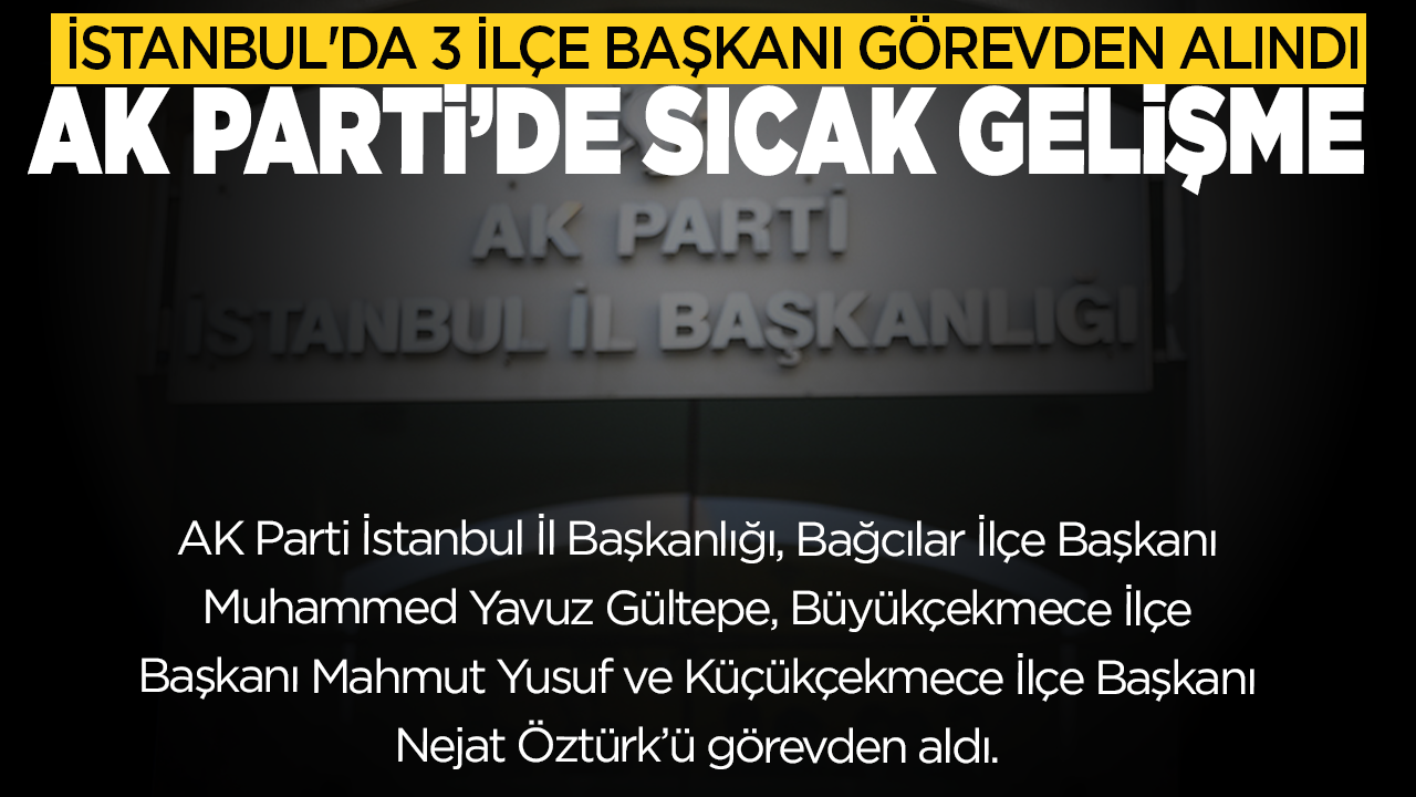 AK Parti İstanbul İl Başkanlığı, Bağcılar İlçe Başkanı Muhammed Yavuz Gültepe, Büyükçekmece İlçe Başkanı Mahmut Yusuf ve Küçükçekmece İlçe Başkanı Nejat Öztürk’ü görevden aldı.