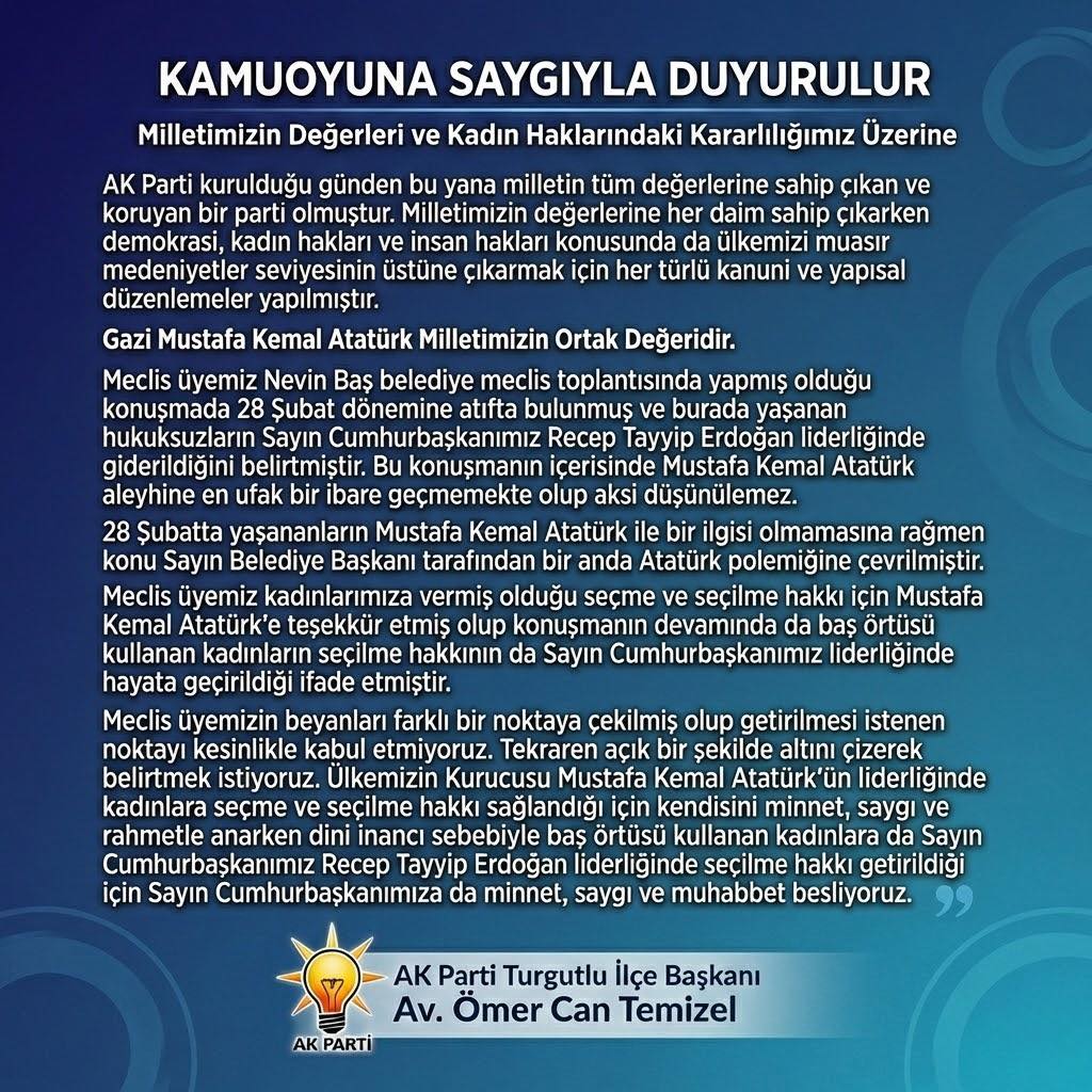 Partisinin kurulduğu günden bu yana milletin değerlerine sahip çıktığını vurgulayan AK Parti Turgutlu İlçe Başkanı Av. Ömer Can Temizel, belediye meclis toplantısında yaşananlara ilişkin açıklamalarda bulundu. Meclis üyesi Nevin Baş’ın konuşmasında 28 Şubat dönemindeki hukuksuzlukların Cumhurbaşkanı Recep Tayyip Erdoğan liderliğinde giderildiğine değindiğini belirten Temizel, konuşmada Gazi Mustafa Kemal Atatürk aleyhine tek bir ifade dahi bulunmadığını ifade etti.