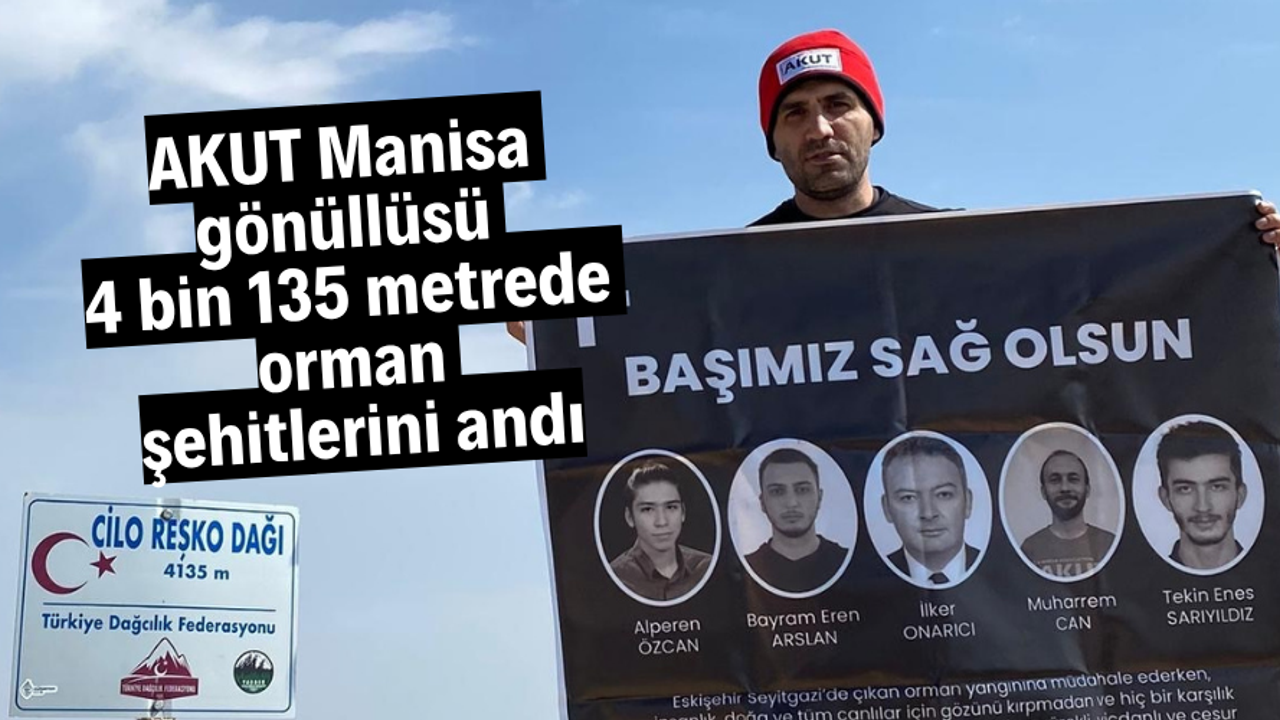 MANİSA (İHA) - 22 Temmuz tarihinde Eskişehir Seyitgazi’de çıkan orman yangınına müdahale ederken şehit düşen AKUT Arama Kurtarma Derneği Ankara Ekibi gönüllüleri Alperen Özcan, Bayram Eren Arslan, İlker Onarıcı, Muharrem Can ve Tekin Enes Sarıyıldız’ın fotoğrafını sırt çantasında zirveye taşıyan Cem Koca, "Zirveyi AKUT gönüllüsü şehitlerimize adıyorum" paylaşımıyla 4 bin 135 metre yükseklikteki Reşko Dağı zirvesinden arkadaşlarına selam gönderdi.