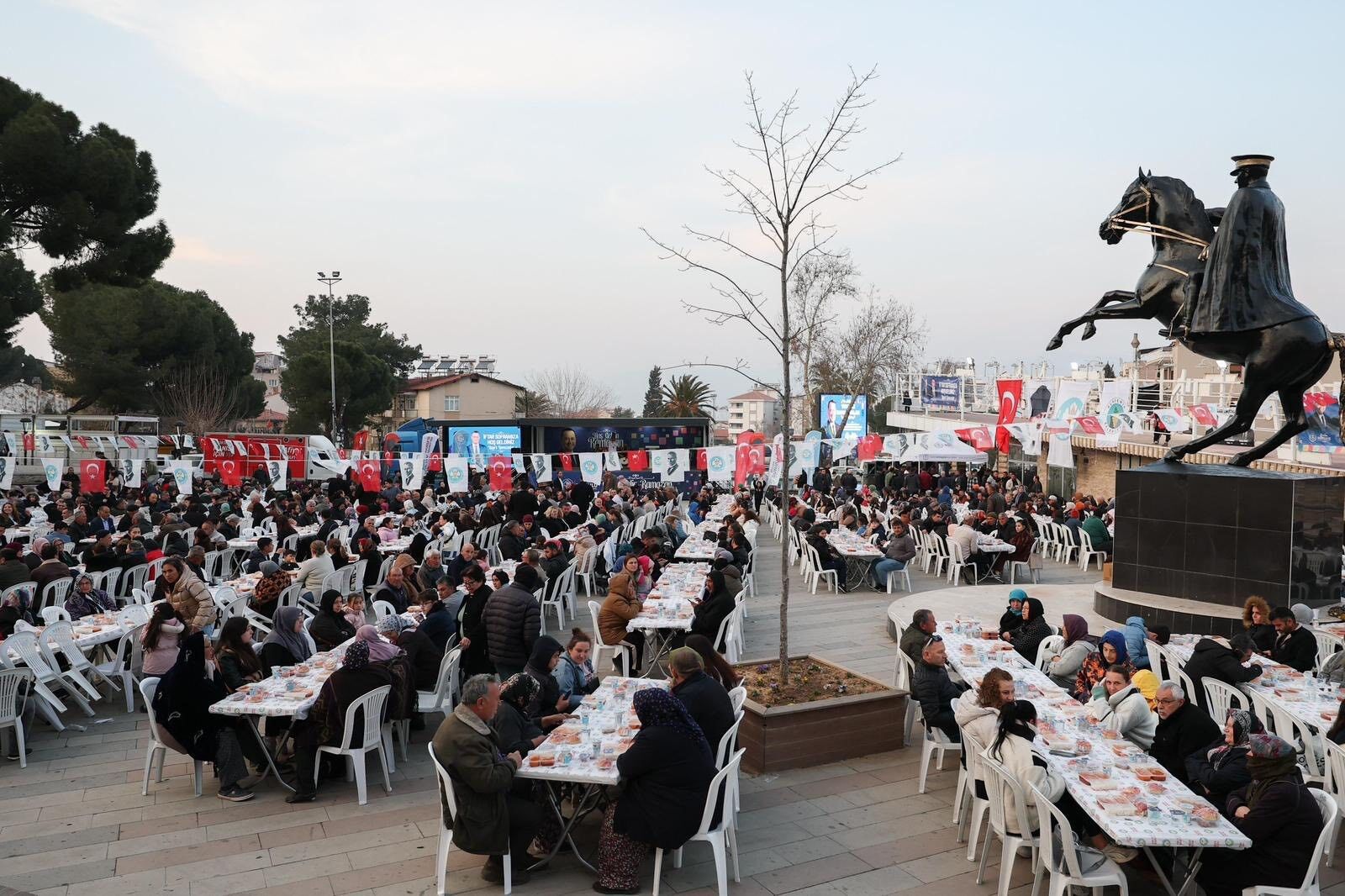 Ramazan ayının birlik ve beraberlik iklimini şehrin dört bir yanına taşıyan Manisa Büyükşehir Belediyesi, Alaşehir'de yüzlerce vatandaşı aynı sofrada buluşturdu. Programa Manisa Büyükşehir Belediye Başkanı Besim Dutlulu, Alaşehir Belediye Başkanı Ahmet Öküzcüoğlu, Sarıgöl Belediye Başkanı Tahsin Akdeniz, MASKİ Genel Müdürü Ali Kılıç, Büyükşehir Belediyesi Genel Sekreter Yardımcıları Ulaş Aydın ve Erk Kayabaş, sivil toplum kuruluşu temsilcileri, mahalle muhtarları ve çok sayıda vatandaş katıldı. İftar öncesinde alana gelen Başkan Besim Dutlulu ve Alaşehir Belediye Başkanı Ahmet Öküzcüoğlu, masaları tek tek gezerek vatandaşları selamladı. Oruçların hep birlikte açıldığı iftar programında, Ramazan ayının bereketi paylaşıldı. Yemek sonrası çocuklar için düzenlenen geleneksel Hacivat-Karagöz gölge oyunu ile jonglör ve sihirbazlık gösterileri, hem çocuklardan hem de ailelerinden büyük beğeni topladı.
