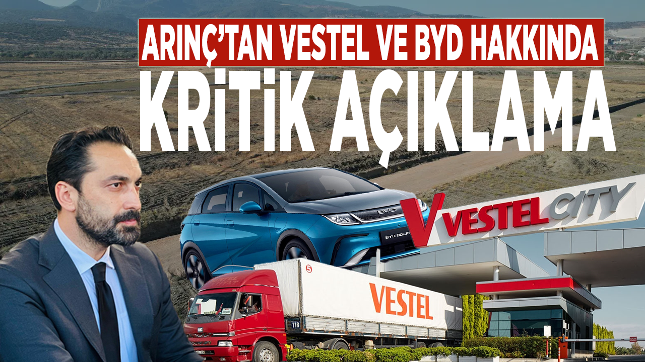 BYD'nin yatırımıyla ilgili değerlendirmelerde bulunan Arınç, "BYD alakalı bir gecikme söz konusu değil. Orada tabii hepimizin hassasiyeti, daha önce yaşadığımız bir Volkswagen. hadisesi vardı, onun tekrarını hiçbirimiz istemiyoruz ama yatırım başlandı. Hibrit bir proje olarak devamında da yapılacağı için proje güncellemesine gidildi ve hızlı bir şekilde tekrardan o yatırım kazandırılacak. BYD ile alakalı bir gecikme veyahut da sonunda intikaya veya ikamete uğrayacak bir durum söz konusu değil. Vesaire alakalı da bu sürecin takipçisiyiz ama. Ekonomik şartlarda veya KAP anlamında bu işin marka değerinde kötülememek veyahut da ekonomiyi tedirgin etmeme adına Vestel dahil olmak üzere şirketlere son durumunu hem kendilerine düşen yapmaları gerekenleri hem de devletin takip ettiği konular var. Onların da biz takipçisiyiz. Yakın zamanda da inşallah bu konuyla alakalı. Ben milletvekillerimizle de istişare ediyoruz. Bir açıklama yapacağız ama hassas olması gereken bir süreç" dedi.