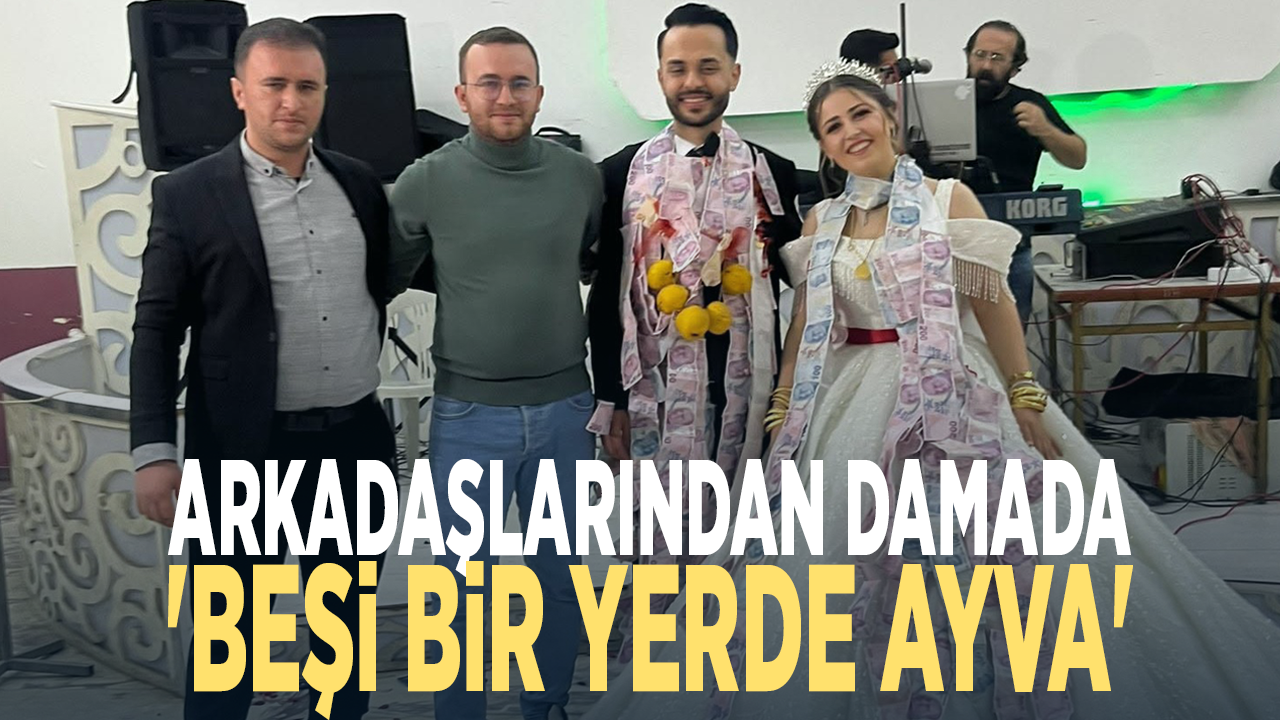 Düğünde damada takılan "beşi bir yerde ayva" ise geceye damga vururken, davetliler uzun süre bu esprili takı merasimini konuştu.