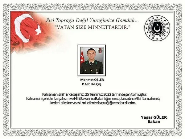 "Kahraman silah arkadaşımız, 25 Temmuz 2023 tarihinde şehit olmuştur. Kahraman şehidimize şahsım ve Milli Savunma Bakanlığı adına Allah'tan rahmet; kederli ailesine ve asil milletimize başsağlığı ve sabır diliyorum."