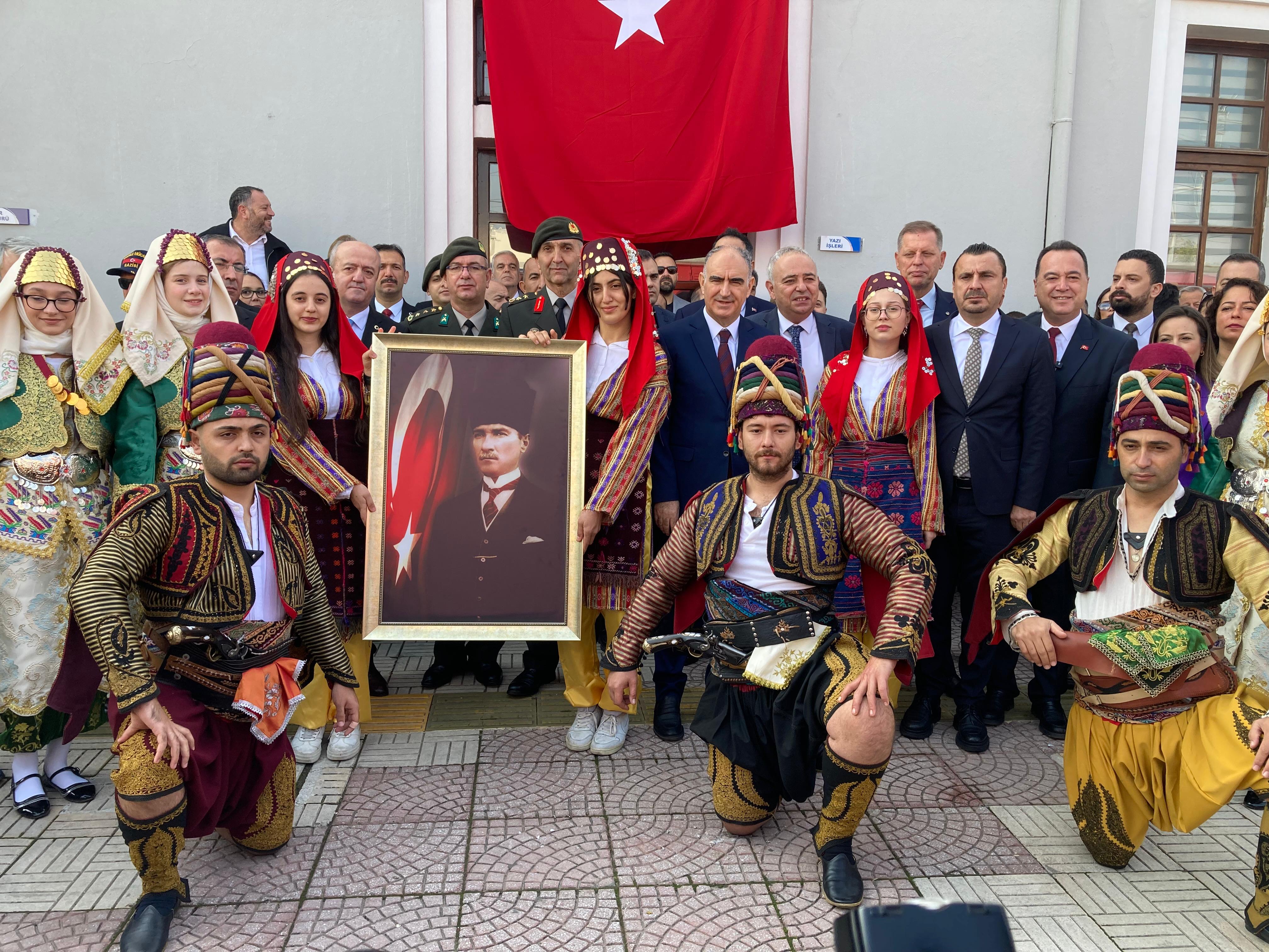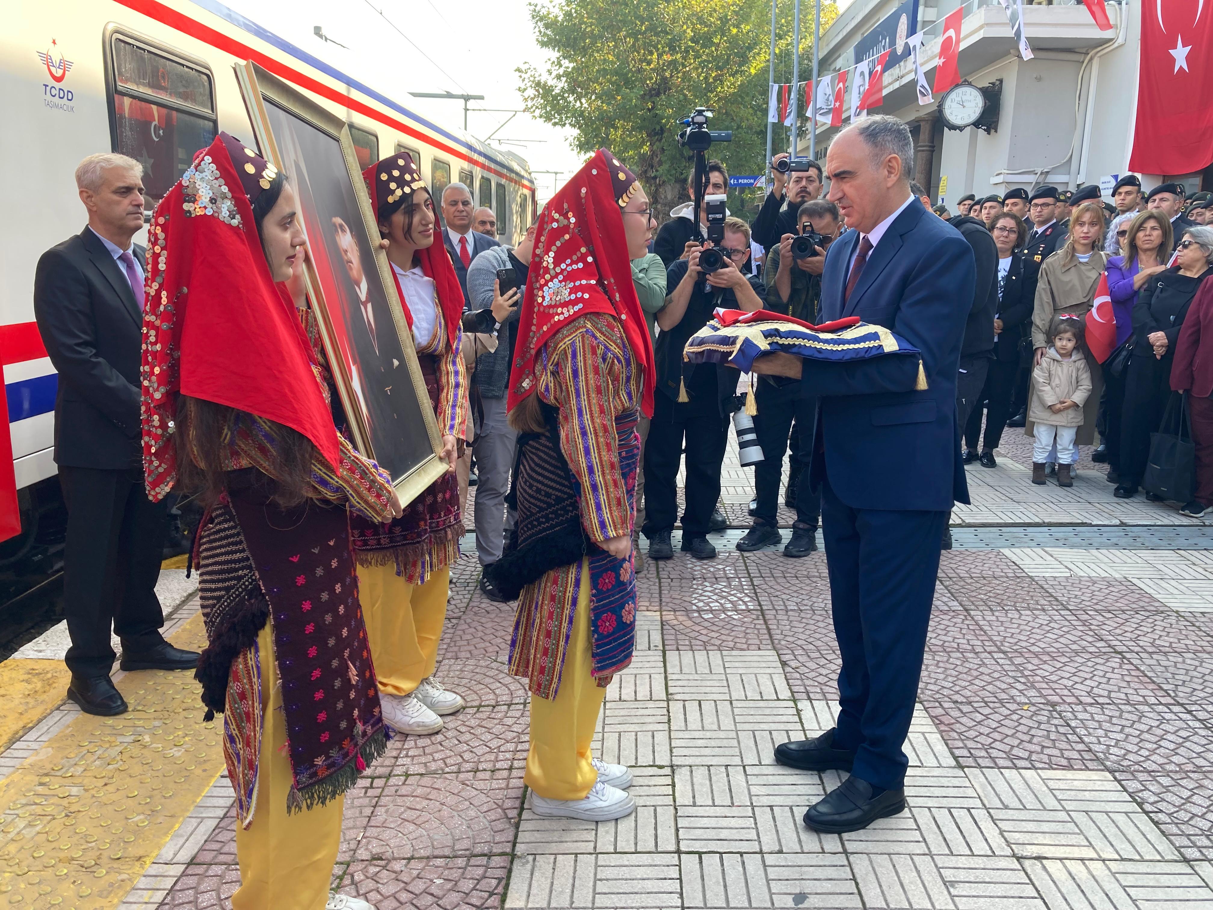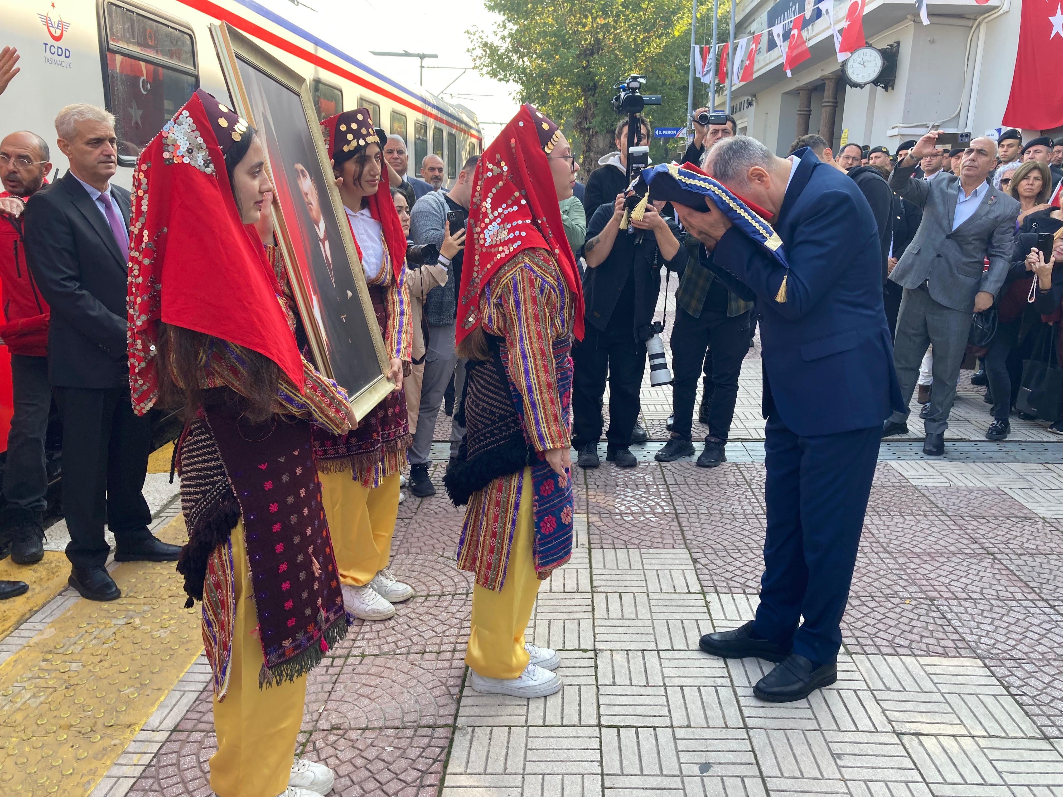 Trenin müzik eşliğinde gara gelişiyle birlikte, yöresel kıyafetli öğrenciler tarafından Atatürk tablosu ve Türk bayrağı trenden indirildi.