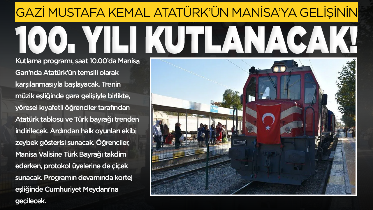 Kutlama programı, saat 10.00’da Manisa Garı’nda Atatürk’ün temsili olarak karşılanmasıyla başlayacak. Trenin müzik eşliğinde gara gelişiyle birlikte, yöresel kıyafetli öğrenciler tarafından Atatürk tablosu ve Türk bayrağı trenden indirilecek. Ardından halk oyunları ekibi zeybek gösterisi sunacak. Öğrenciler, Manisa Valisine Türk Bayrağı takdim ederken, protokol üyelerine de çiçek sunacak. Programın devamında kortej eşliğinde Cumhuriyet Meydanı’na geçilecek.