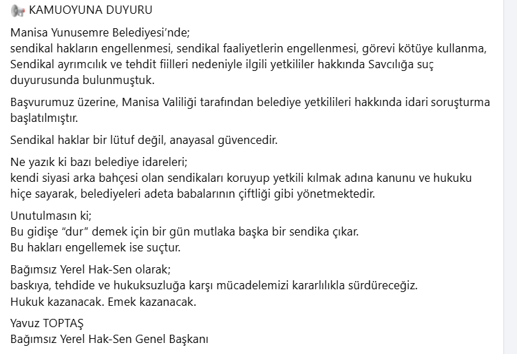 Bağımsız Yerel Hak-Sen Genel Başkanı Yavuz Toptaş, Yunusemre Belediyesi ile ilgili dikkat çeken açıklamalarda bulundu.