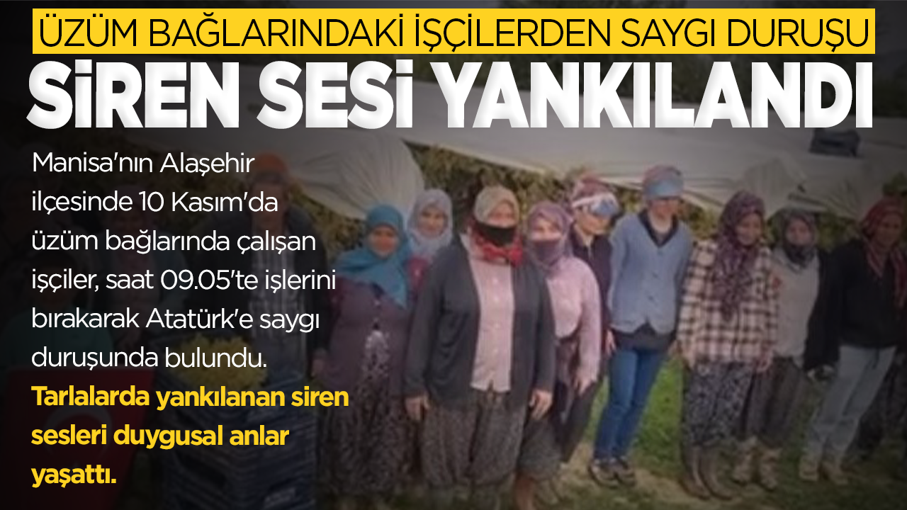 Manisa'nın Alaşehir ilçesinde 10 Kasım'da üzüm bağlarında çalışan işçiler, saat 09.05'te işlerini bırakarak Atatürk'e saygı duruşunda bulundu. Tarlalarda yankılanan siren sesleri duygusal anlar yaşattı.