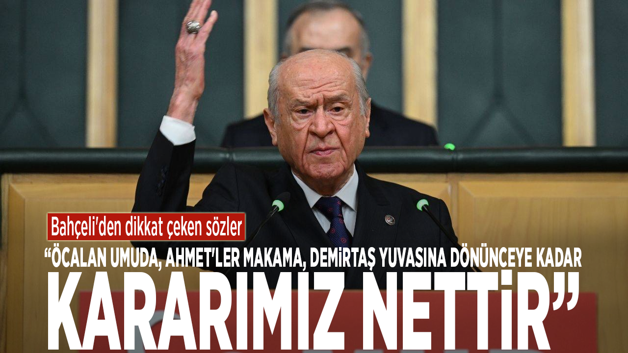 Bahçeli, konuşmasında Türkiye’deki sürece ve CHP Genel Başkanı Özgür Özel’in “erken seçim” çağrılarına ilişkin açıklamalara yer verirken, grup toplantısını şu sözlerle tamamladı: "Anadolu huzura, Öcalan umuda, Ahmet'ler makama, Demirtaş yuvasına dönünceye kadar kararımız nettir." Bahçeli'nin konuşmasında öne çıkanlar şöyle: