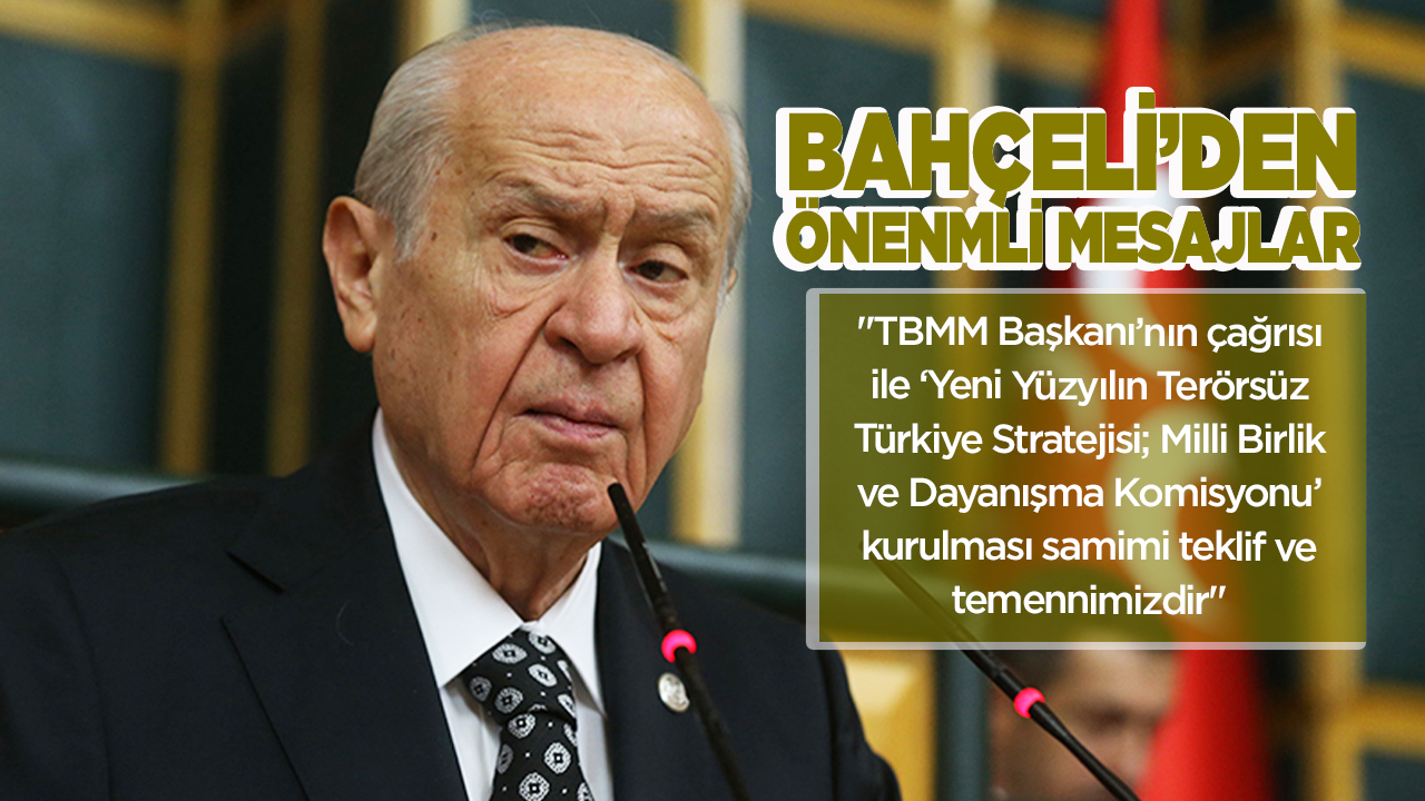 Önümüzdeki dönemin yol haritasını belirlemek üzere anayasal görev, yetki ve sorumlulukla birlikte milli iradenin tecelligahı olan TBMM’de bütün toplumsal kesimlerin temsilcileri olan siyasi partilerin katılımı ile bir komisyon kurulmasının akla en yatkın seçenek olduğunu kaydeden Bahçeli,
