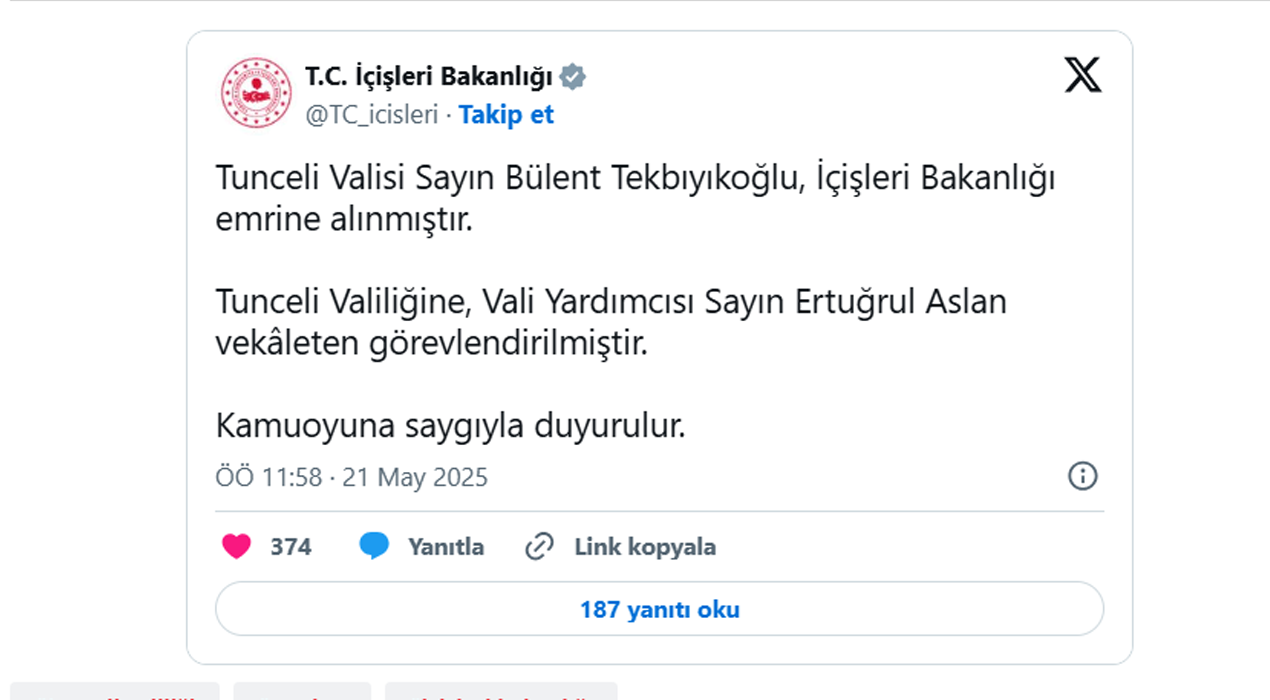 “Tunceli Valisi sayın Bülent Tekbıyıkoğlu, İçişleri Bakanlığı emrine alınmıştır. Tunceli Valiliğine, Vali Yardımcısı Sayın Ertuğrul Aslan vekâleten görevlendirilmiştir. Kamuoyuna saygıyla duyurulur.”