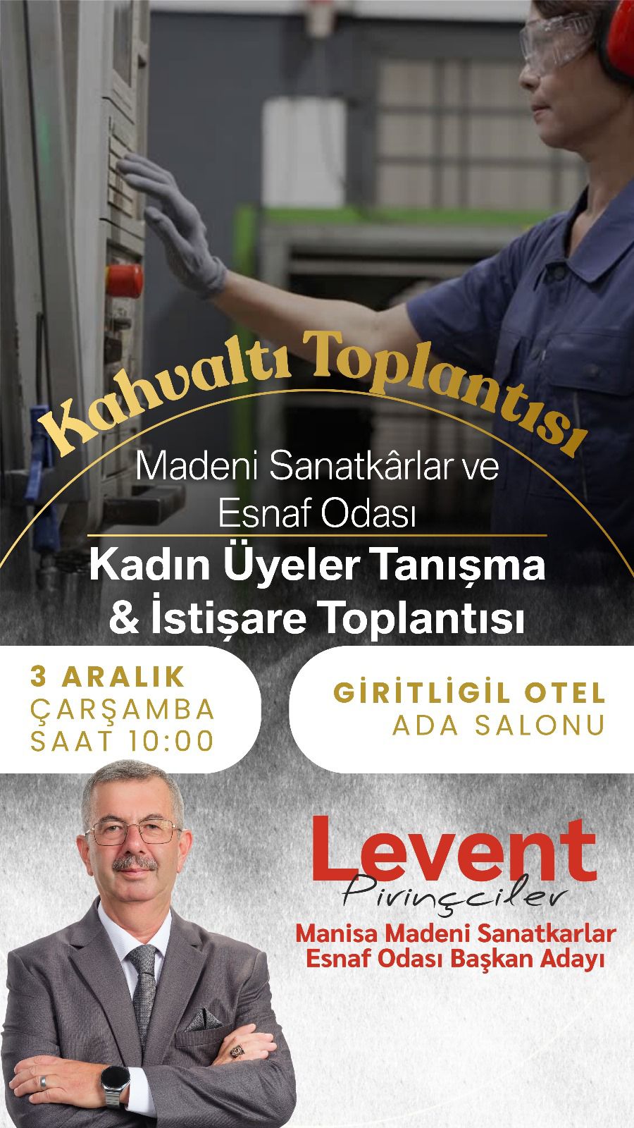Manisa Sanatkarlar Esnaf Odası Başkan adayı Levent Pirinçciler, 3 Aralık Çarşamba günü Giritligil Otel' de odanın kadın üyeleri için kahvaltı düzenliyor. Kahvaltıda Levent Pirinçciler 7 Ocak 2026'daki seçim için adaylığını ve projelerini açıklayacak.
