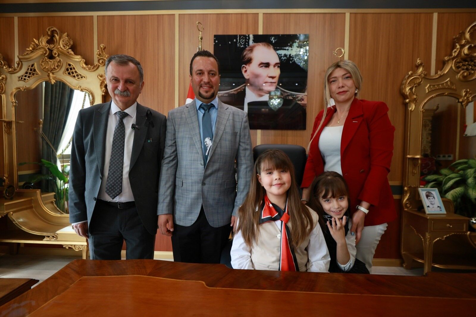 Yunusemre Belediye Başkanı Semih Balaban, 23 Nisan Ulusal Egemenlik ve Çocuk Bayramı’nda makamında çocukları konuk etti. Yunusemre Belediyesi Barış Manço Çocuk Kültür ve Sanat Merkezi öğrencisi Derin Beklergül, 23 Nisan Ulusal Egemenlik İlkokulu 1. sınıf öğrencisi Günnur Berrak Koç, kardeşi Öykü Nisa Koç, Hatice Görgülü İlkokulu 1. Sınıf Öğrencisi Mehmet Serhan Şengel, Üzümcüler İlkokulu 3. sınıf öğrencisi Emre Büyükşahin’i konuk etti. Makamı temsili olarak Başkan Balaban’dan devralan 23 Nisan Ulusal Egemenlik İlkokulu 1. sınıf öğrencisi Günnur Berrak Koç’un heyecanı ise görülmeye değerdi.