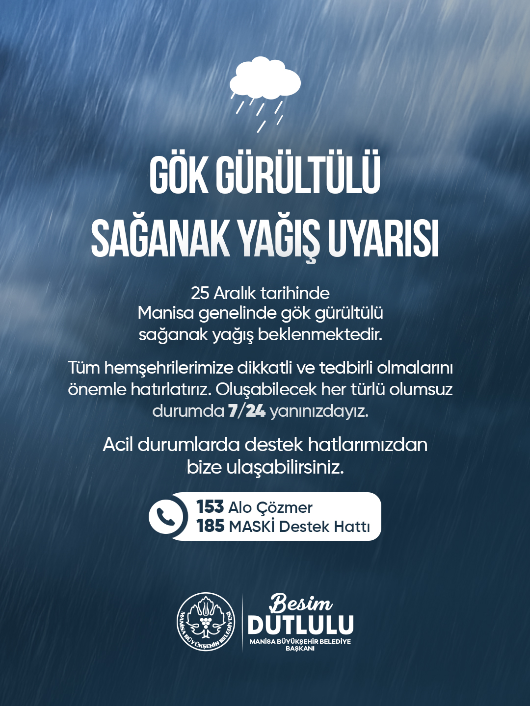 Meteorolojik veriler doğrultusunda yapılan duyuruda, 25 Aralık tarihinde Manisa merkez ve ilçelerinde gök gürültülü sağanak yağışın etkili olacağı bildirildi. Büyükşehir Belediyesi, yağış nedeniyle oluşabilecek sel, su baskını ve ulaşımda aksamalar gibi olumsuzluklara karşı tüm birimleriyle teyakkuza geçti. Yapılan açıklamada, vatandaşların can ve mal güvenliğini korumak adına gerekli önlemleri almaları istenirken, belediye ekiplerinin her türlü olumsuz duruma karşı 7/24 sahada olacağı vurgulandı.