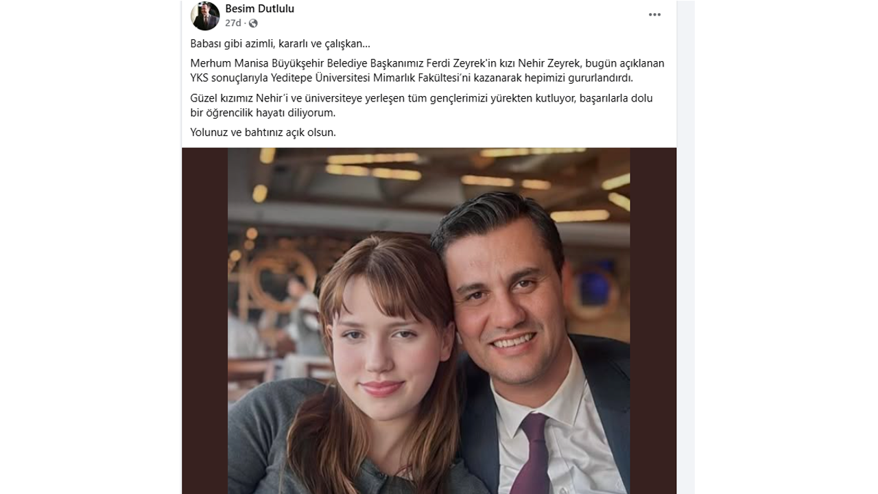 Dutlulu, paylaşımında Nehir’in babası gibi azimli, kararlı ve çalışkan olduğunu vurgulayarak, “Merhum Manisa Büyükşehir Belediye Başkanımız Ferdi Zeyrek’in kızı Nehir Zeyrek, bugün açıklanan YKS sonuçlarıyla Yeditepe Üniversitesi Mimarlık Fakültesi’ni kazanarak hepimizi gururlandırdı.