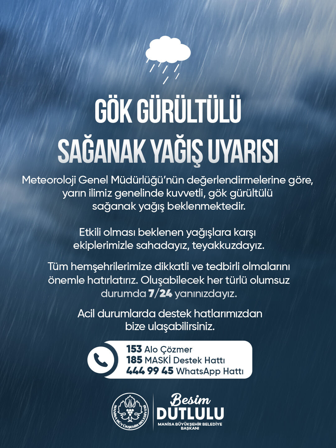 Manisa Büyükşehir Belediye Başkanı Besim Dutlulu, Meteoroloji Genel Müdürlüğü’nden alınan son veriler doğrultusunda il genelinde beklenen kuvvetli ve gök gürültülü sağanak yağışlara karşı vatandaşları uyardı. Yapılan değerlendirmelere göre, yağışların yarından itibaren şehir genelinde etkili olması bekleniyor.