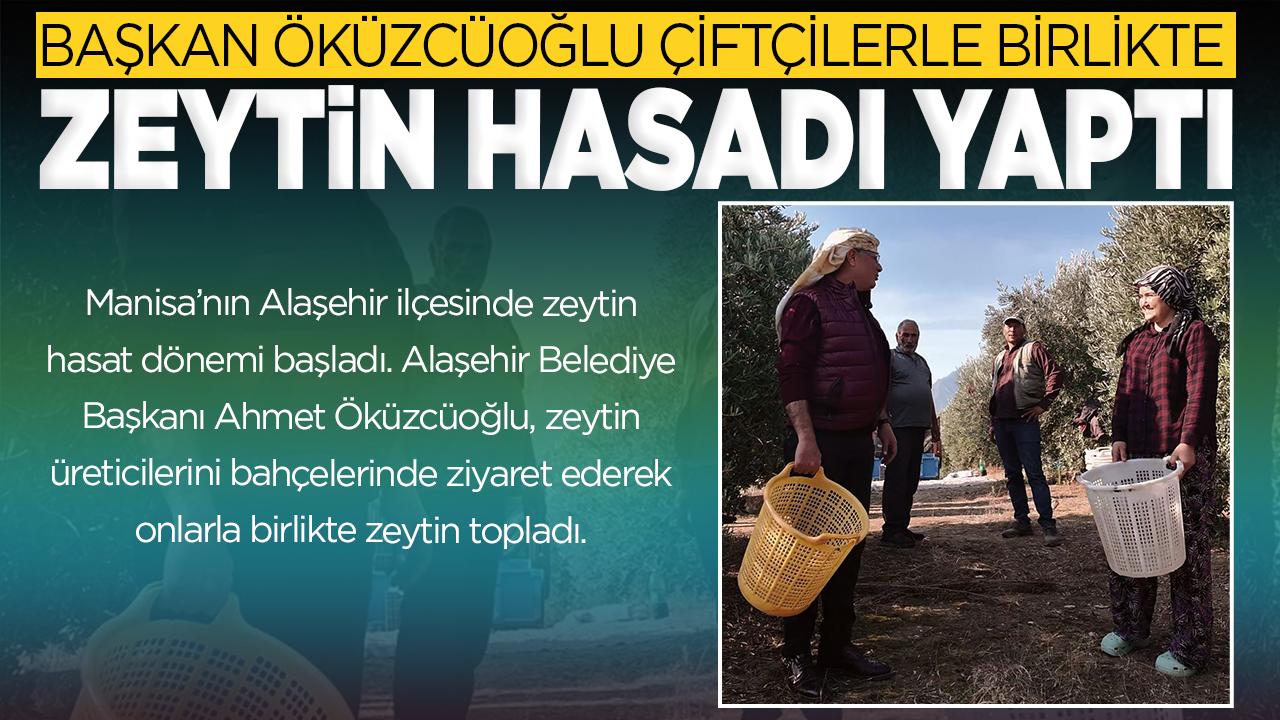 Manisa’nın Alaşehir ilçesinde zeytin hasat dönemi başladı. Alaşehir Belediye Başkanı Ahmet Öküzcüoğlu, zeytin üreticilerini bahçelerinde ziyaret ederek onlarla birlikte zeytin topladı.