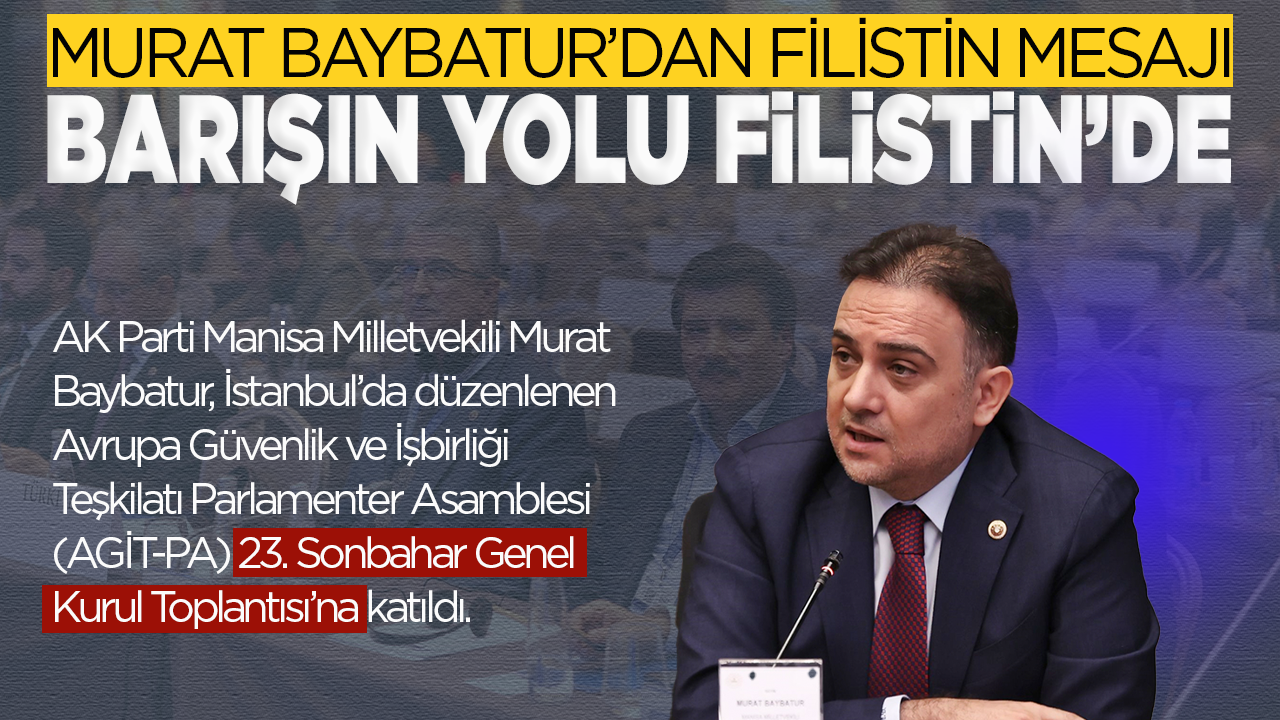İstanbul’da düzenlenen Avrupa Güvenlik ve İşbirliği Teşkilatı Parlamenter Asamblesi (AGİT-PA) 23. Sonbahar Genel Kurul Toplantısında konuşan AK Parti Manisa Milletvekili Murat Baybatur, "Dünya barışının şah damarı niteliğindeki bu coğrafyada kalıcı barışın yolu Filistin’den geçmektedir." dedi.