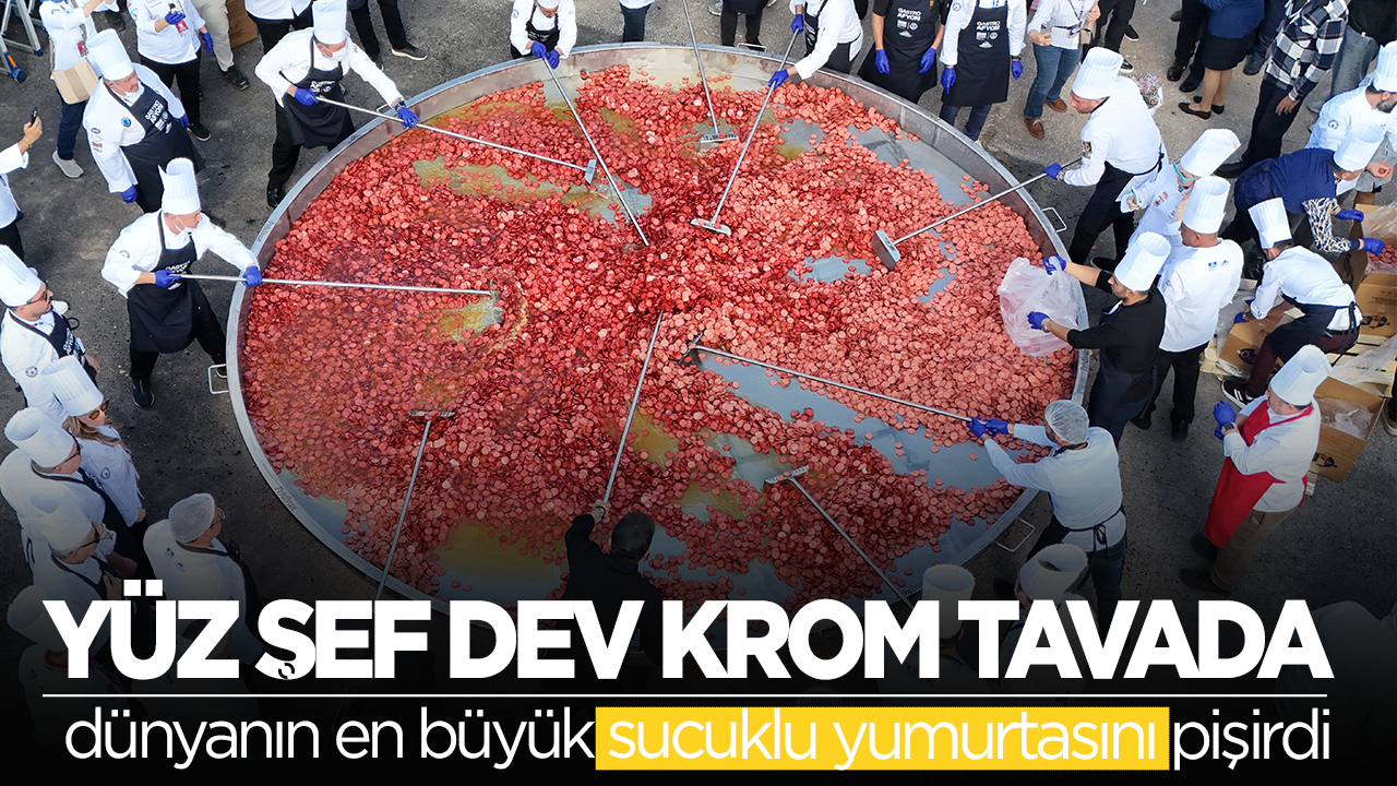 Afyonkarahisar’da gerçekleştirilen 7. Uluslararası Gastro Afyon Festivali’nde 100 şef 25 metrekarelik dev krom tavada bin 930 kiloluk dev sucuklu yumurta yaparak dünya rekoru kırdılar.