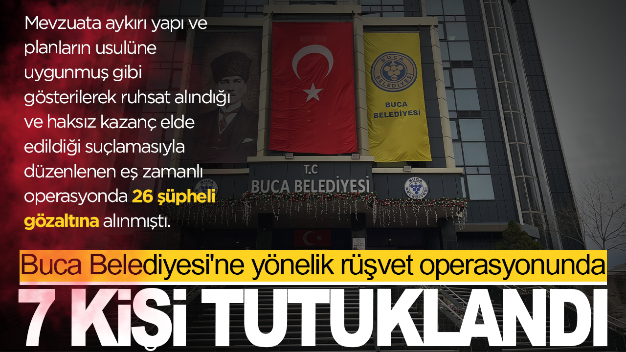 İzmir'de Buca Belediyesi ve bir yapı denetim firmasına yönelik "rüşvet" ve "usulsüz ruhsatlandırma" iddialarıyla düzenlenen operasyonda gözaltına alınarak adliyeye sevk edilen 26 şüpheliden 7'si tutuklandı.
