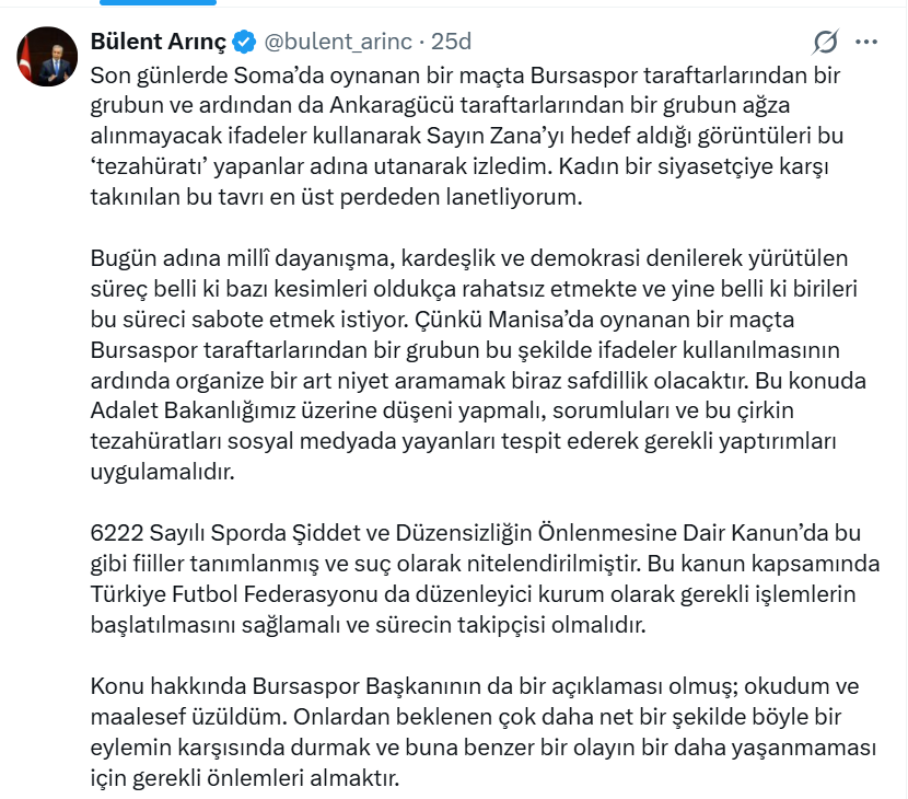 Arınç, açıklamasında, Bursaspor ve Ankaragücü taraftarlarından bazı grupların, kadın bir siyasetçiyi hedef alan tezahüratlarına tepki göstererek, söz konusu ifadeleri kınadığını belirtti.