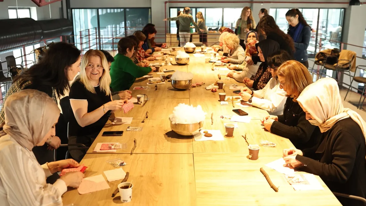 Pancar Deposu’nda gerçekleştirilen atölyeye katılan kadınlar, Gülçin Çalık eğitmenliğinde kapı süsleri tasarladı. Katılımcılar, el emeği ürünlerine son şeklini vermek için özenle çalışırken, aynı zamanda keyifli vakit geçirdi.