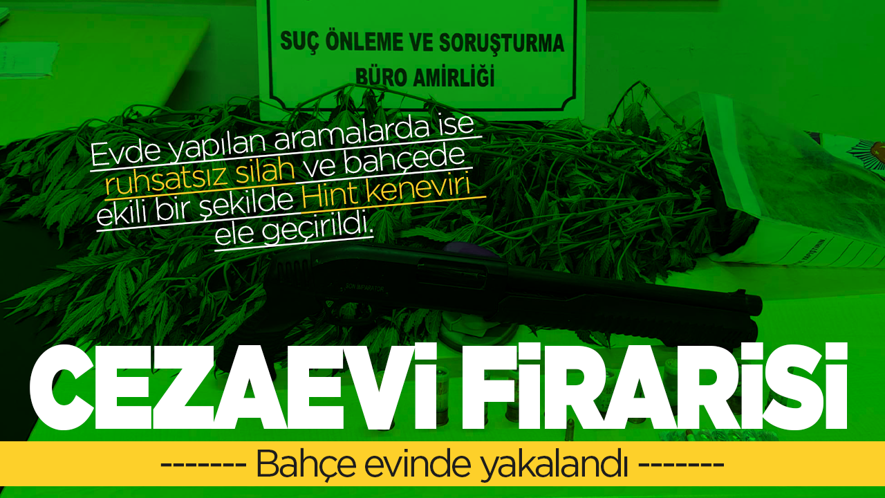 Bahçe evinde yapılan aramada bir adet ruhsatsız pompalı tüfek, çok sayıda kartuş ve fişek, sentetik ecza hapları ile bahçede ekili halde Hint keneviri ele geçirildi.