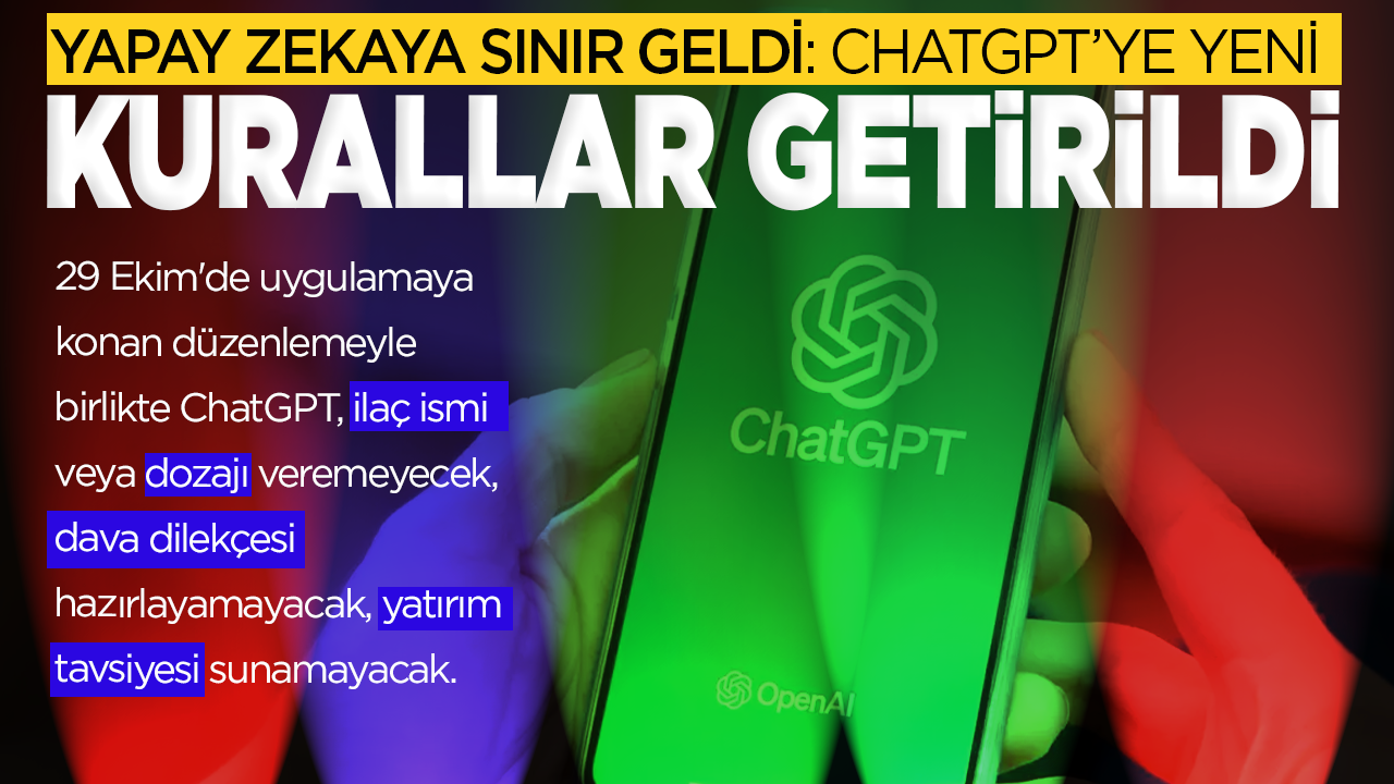 OpenAI, yapay zeka uygulaması ChatGPT'ye 29 Ekim itibarıyla önemli ve katı düzenlemeler getirdi. Bu yeni kurallara göre, sohbet robotu artık kullanıcıların hassas konularla ilgili doğrudan tavsiyelerini yerine getiremeyecek.