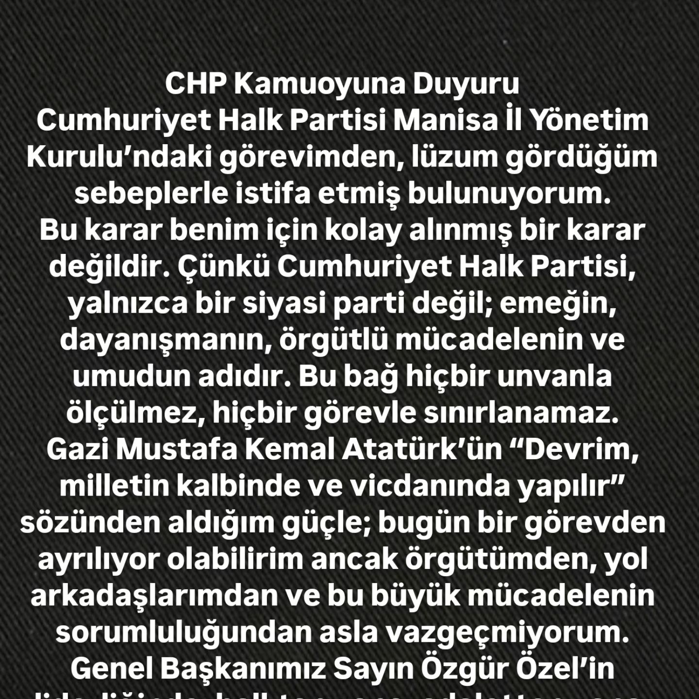 Cumhuriyet Halk Partisi Manisa İl Yönetim Kurulu’ndaki görevimden, lüzum gördüğüm sebeplerle istifa etmiş bulunuyorum.