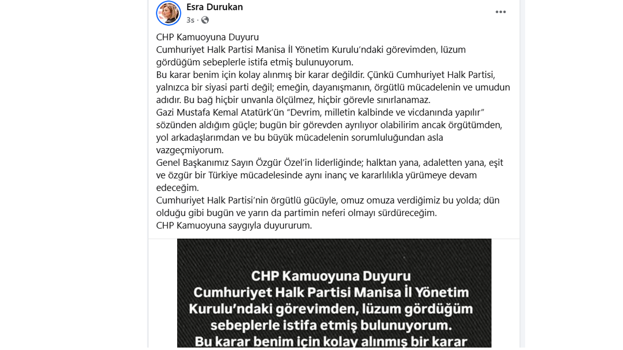 Cumhuriyet Halk Partisi (CHP) Manisa İl Yönetim Kurulu Üyesi Esra Durukan Durukan, yaptığı yazılı açıklamada, CHP Manisa İl Yönetim Kurulu’ndaki görevinden, gerekli gördüğü sebeplerle ayrıldığını belirtti.