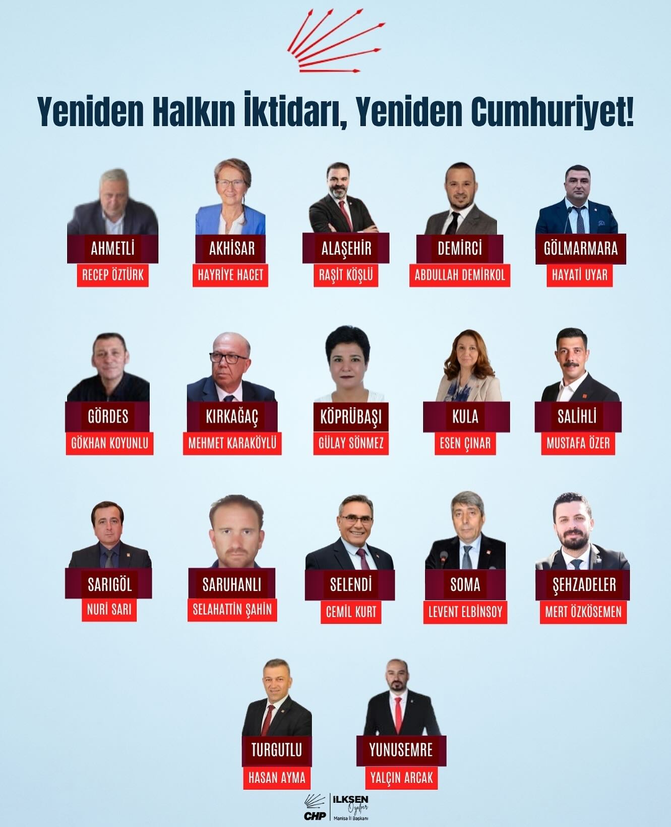 Partinin "Yeniden Halkın İktidarı, Yeniden Cumhuriyet!" sloganıyla duyurduğu yeni dönem ilçe başkanları listesi, Manisa siyasetinde hareketlilik yarattı. Güçlü bir kadroyla sahaya inmeye hazırlanan CHP'de, ilçe kongreleriyle göreve gelen isimler şöyle: