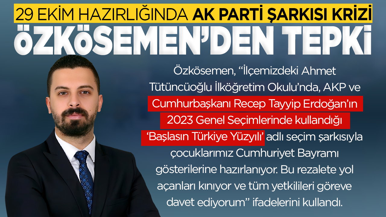 Özkösemen, sosyal medya hesabından yaptığı açıklamada, “İlçemizdeki Ahmet Tütüncüoğlu İlköğretim Okulu’nda, AKP ve Cumhurbaşkanı Recep Tayyip Erdoğan’ın 2023 Genel Seçimlerinde kullandığı ‘Başlasın Türkiye Yüzyılı’ adlı seçim şarkısıyla çocuklarımız Cumhuriyet Bayramı gösterilerine hazırlanıyor. Bu rezalete yol açanları kınıyor ve tüm yetkilileri göreve davet ediyorum” ifadelerini kullandı.