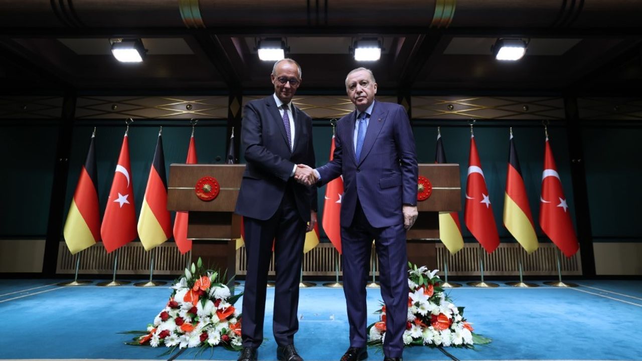 Cumhurbaşkanı Recep Tayyip Erdoğan, Almanya Başbakanı Friedrich Merz ile görüşmesinin ardından ortak basın toplantısı düzenledi. Görüşmede Almanya Başbakanı Merz ile ikili ilişkileri ve uluslararası meseleleri ele aldıklarını aktaran Cumhurbaşkanı Erdoğan, "Şansölye sıfatıyla ülkemize ilk ziyaretini gerçekleştiren Sayın Merz ve heyetini ülkemizde ağırlamaktan büyük bir memnuniyet duyuyorum. Bir defa da sizlerin huzurunda kendilerine hoş geldiniz diyorum. Bugün yaptığımız görüşmelerde iki yakın NATO müttefiki olarak ortak çıkarlarımız zemininde ikili ilişkilerimizi ve uluslararası meseleleri ele aldık. Ayrıca stratejik hedef olarak gördüğümüz Avrupa Birliği’ne tam üyeliğimiz noktasında kendilerinden beklentilerimizi ifade ettik. Türkiye’nin bu konuda sergilediği kararlı iradenin birlik nezdinde hak ettiği karşılığı görmesi durumunda çok kısa sürede ciddi mesafe alabiliriz. Bölgemizde ve dünyada yaşanan gelişmelere bakıldığında Türkiye-Birlik ilişkilerinin stratejik öneminin daha iyi anlaşılacağına inanıyorum" dedi.
