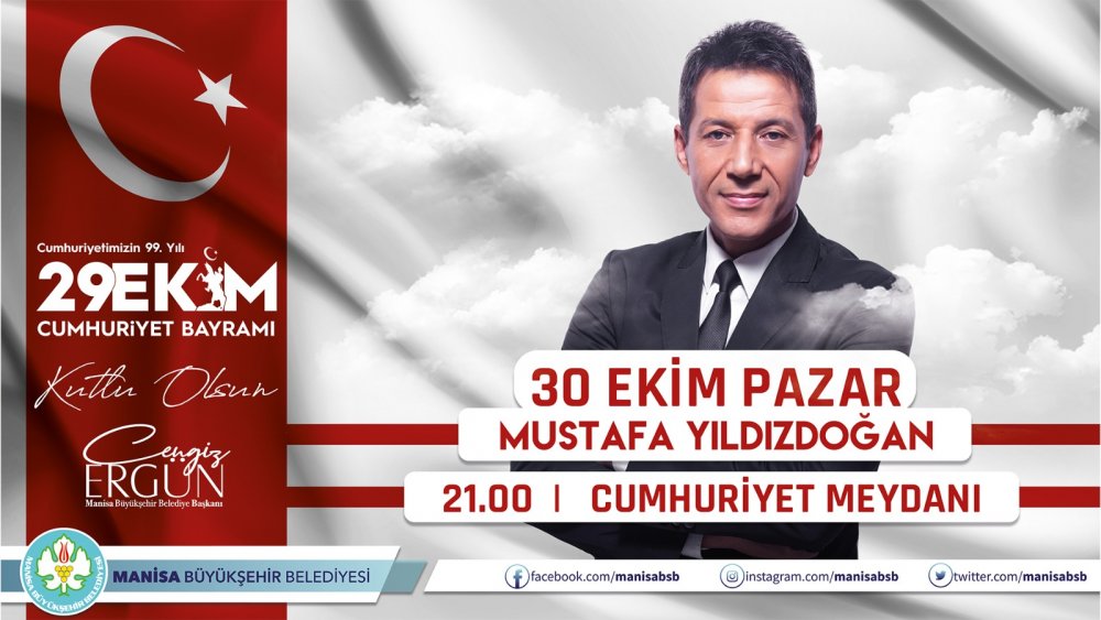 Türkiye, Cumhuriyetimizin kuruluşunun 99’uncu yılını kutlayacak olmanın heyecanını yaşarken, Manisa Büyükşehir Belediyesi de bu heyecanı katlayacak çalışmalara imza atacak. Şehrin dört bir yanını bayraklarla donatacak olan Manisa Büyükşehir Belediyesi, 29 Ekim Cumartesi günü resmi kutlama törenlerinin akabinde düzenleyeceği fener alayı ve konserlerle Cumhuriyet coşkusunu zirveye taşıyacak. 29 Ekim Cumartesi günü resmi kutlama programının sonrasında saat 20.30’da fener alayı düzenlenecek. Sultan Camii önünden başlayacak olan kortej, Cumhuriyet Meydanı’nda noktalanacak. Burada Türk müziğinin sevilen sesleri Ahmet Şafak ve Osman Öztunç sahne alacak. Coşku bununla bitmeyecek. 30 Ekim Pazar günü de, yine Cumhuriyet Meydanı’nda Türk Halk Müziği’nin güçlü ve sevilen ismi Mustafa Yıldızdoğan Manisalı hayranlarıyla buluşacak. Düzenlenecek olan kutlama programı ve etkinliklere tüm Manisalıları davet eden Manisa Büyükşehir Belediye Başkanı Cengiz Ergün, “Cumhuriyet coşkumuzu hep birlikte yaşayalım” dedi.