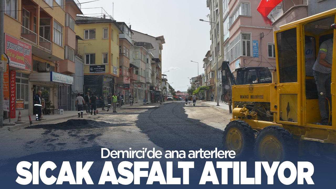 Kamyonlarla Kaymakam İbrahim Ethem Akıncı Caddesi istikametinden Çereşe Meydanı istikametinde bozulmuş ve çukur haline gelmiş yollara uygulanıyor. Ana caddeye serilen sıcak asfalt greyder ile serilerek silindir ile de sıkıştırma yapılıyor. Demirci Belediye Başkanı Erkan Kara'da, sıcak asfalt çalışmalarının yapıldığı caddelerde ekiplerle birlikte çalışmaları koordine etti.