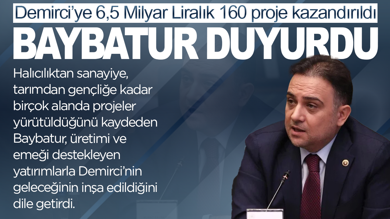 Baybatur, Demirci’nin emekçilerin, alın terinin ve üretimin şehri olduğunu belirterek, ilçeye yönelik 160 projenin toplam 6,5 milyar liralık yatırımla hayata geçirildiğini ifade etti.