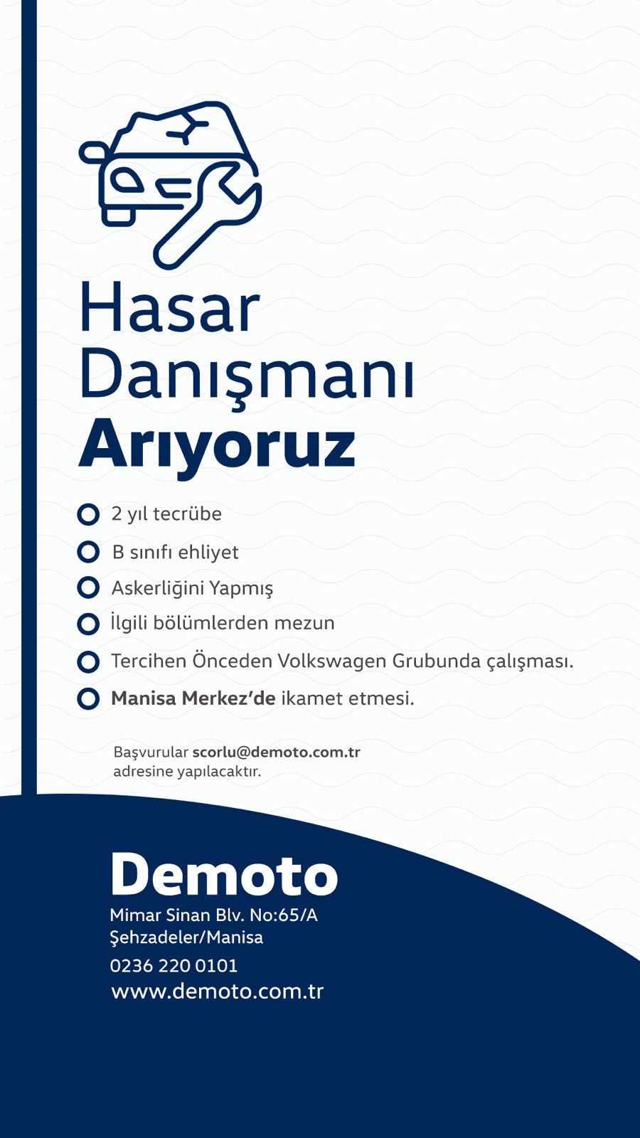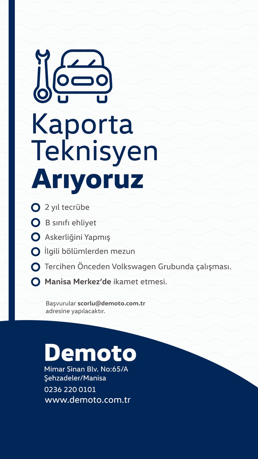 Yayınlanan iş ilanlarına göre, Demoto özellikle tecrübeli ve sektöre hakim isimleri kadrosuna katmayı hedefliyor. Kaporta Teknisyeni ve Hasar Danışmanı pozisyonları için 2 yıl tecrübe ve B sınıfı ehliyet şartı aranırken, tüm pozisyonlar için askerlik hizmetinin tamamlanmış olması ve ilgili bölümlerden mezuniyet şartı bulunuyor.