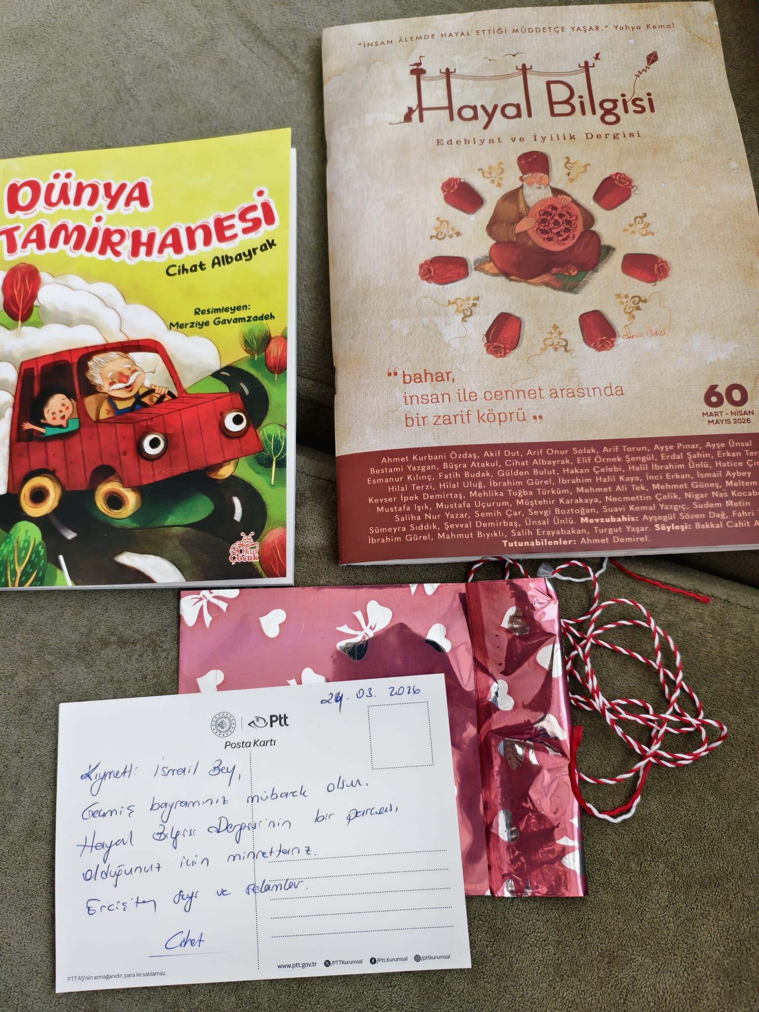 Derginin son sayısı iki sürprizle geldi. Derginin Genel Yayın Yönetmeni Cihat Albayrak’ın kaleme aldığı “Dünya Tamirhanesi” isimli kitabını, oğlum için imzalayarak hediye paketi içinde gönderilmiş. Bir de, bayram tebrikinin bulunduğu kartpostal göndermeleri beni maziye götürdü. Van'dan Manisa'ya sadece kelimeler değil, pullu bir kartpostalın nezaketi de ulaştı. Hediyeler için teşekkür ediyorum.