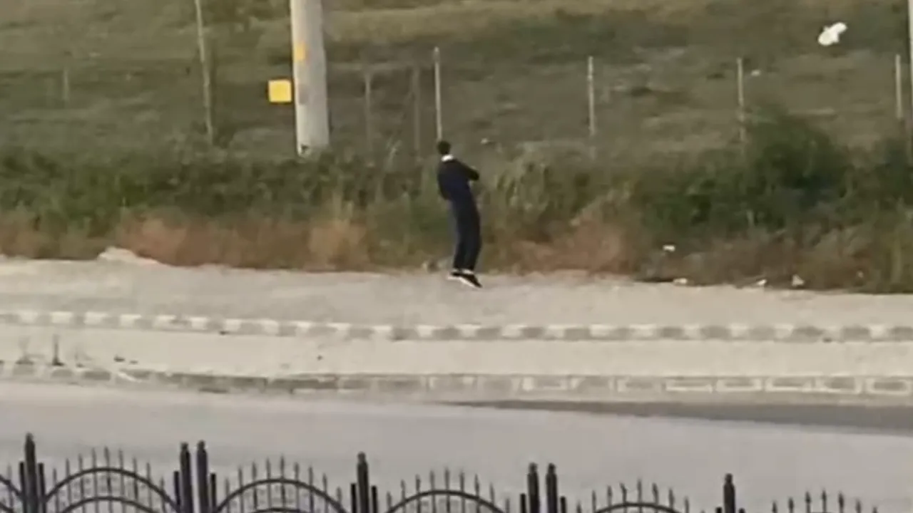 Yoldan geçen bir vatandaş, kaldırımda dakikalarca boks hareketleri yapan genci fark ederek cep telefonu kamerasıyla görüntüledi.