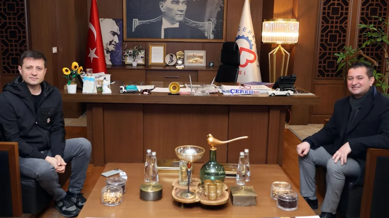 Edirne'de Yenimuhacır Belediye Başkanı Tamer Kıral, Çerkezköy Belediye Başkanı Vahap Akay’ı ziyaret etti.Erdoğan DEMİR / EDİRNE (İGFA) - Yenimuhacır Belediye Başkanı Tamer Kıral'dan Çerkezköy Belediye Başkanı Vahap Akay'a yapılan nezaket ziyaretinde, belediyelerin birlik ve dayanışma içindeki çalışmaları görüşüldü.