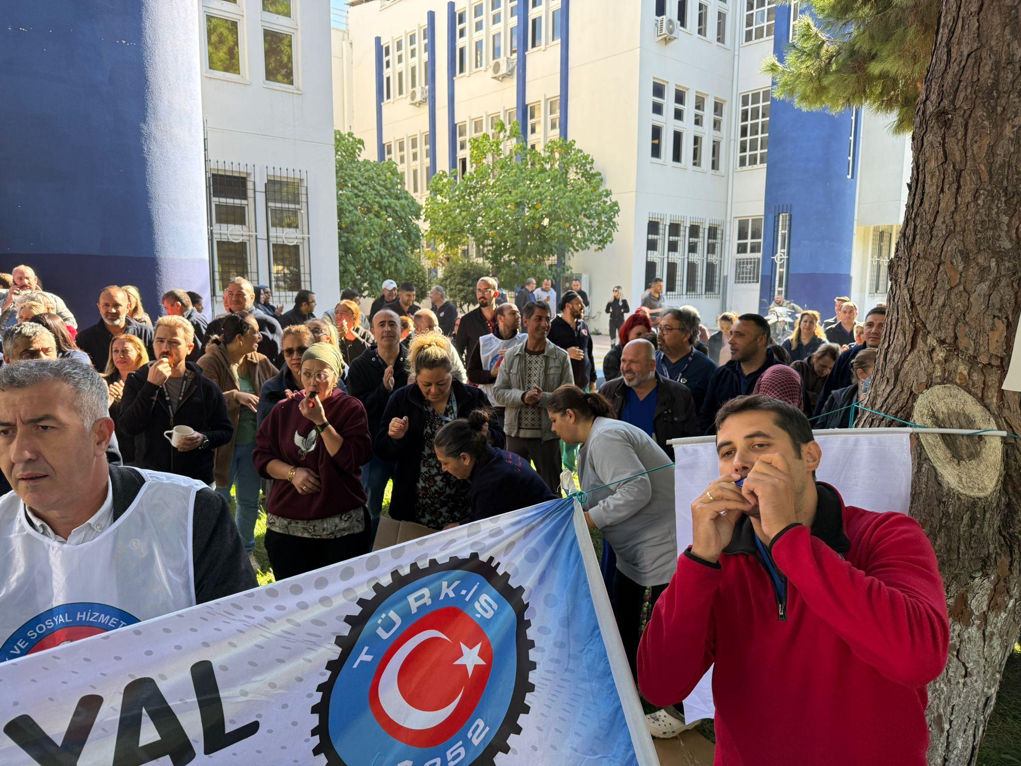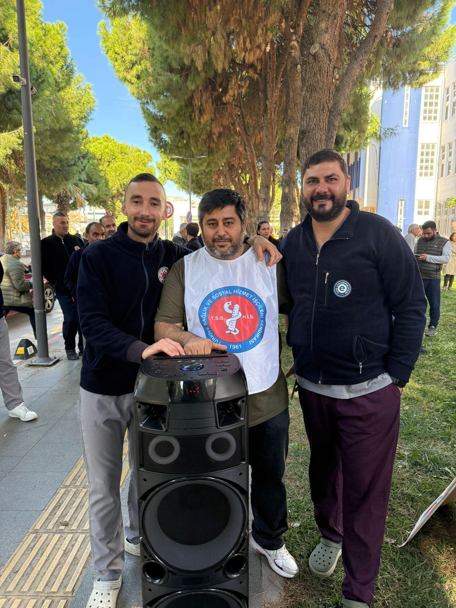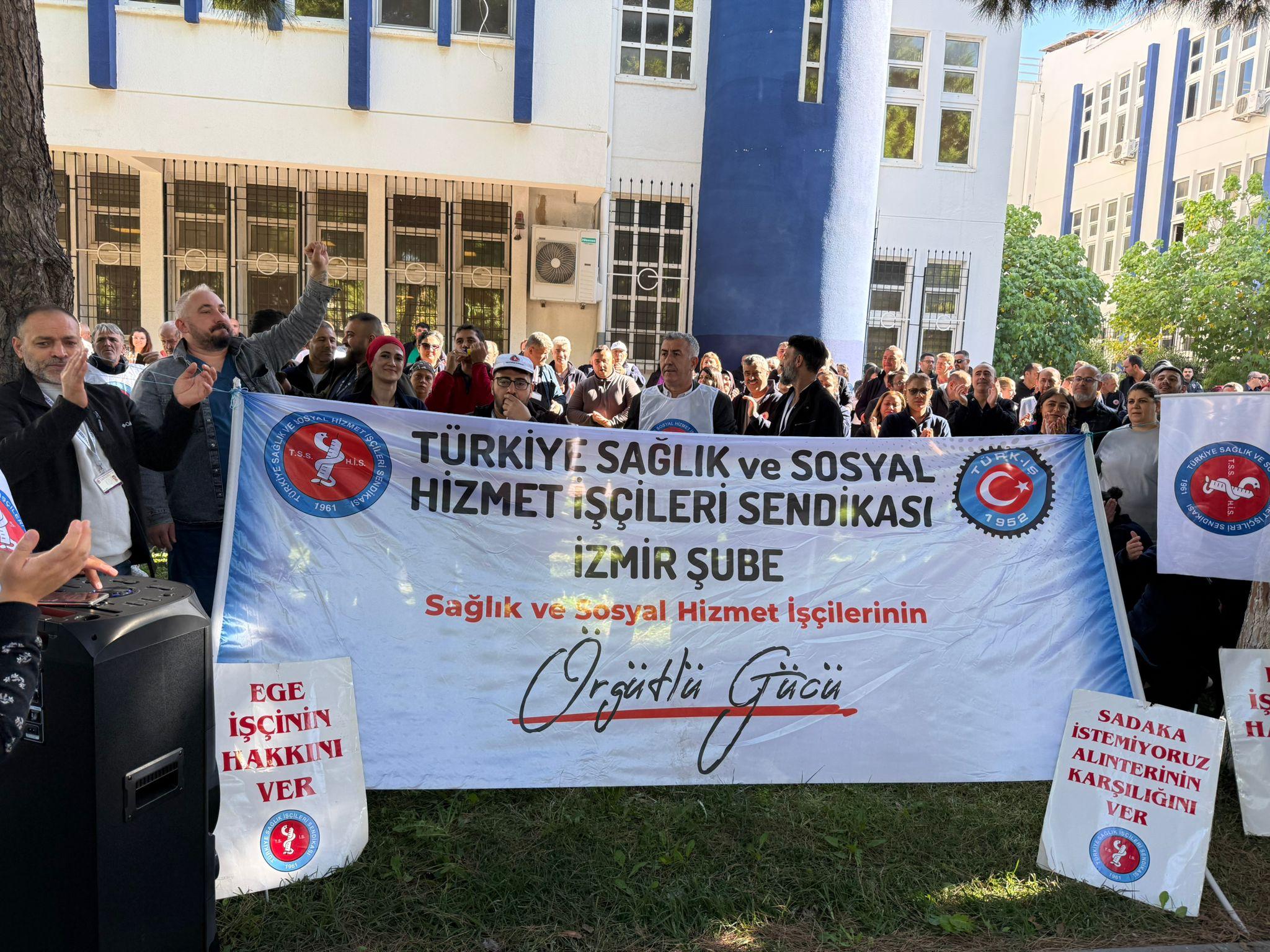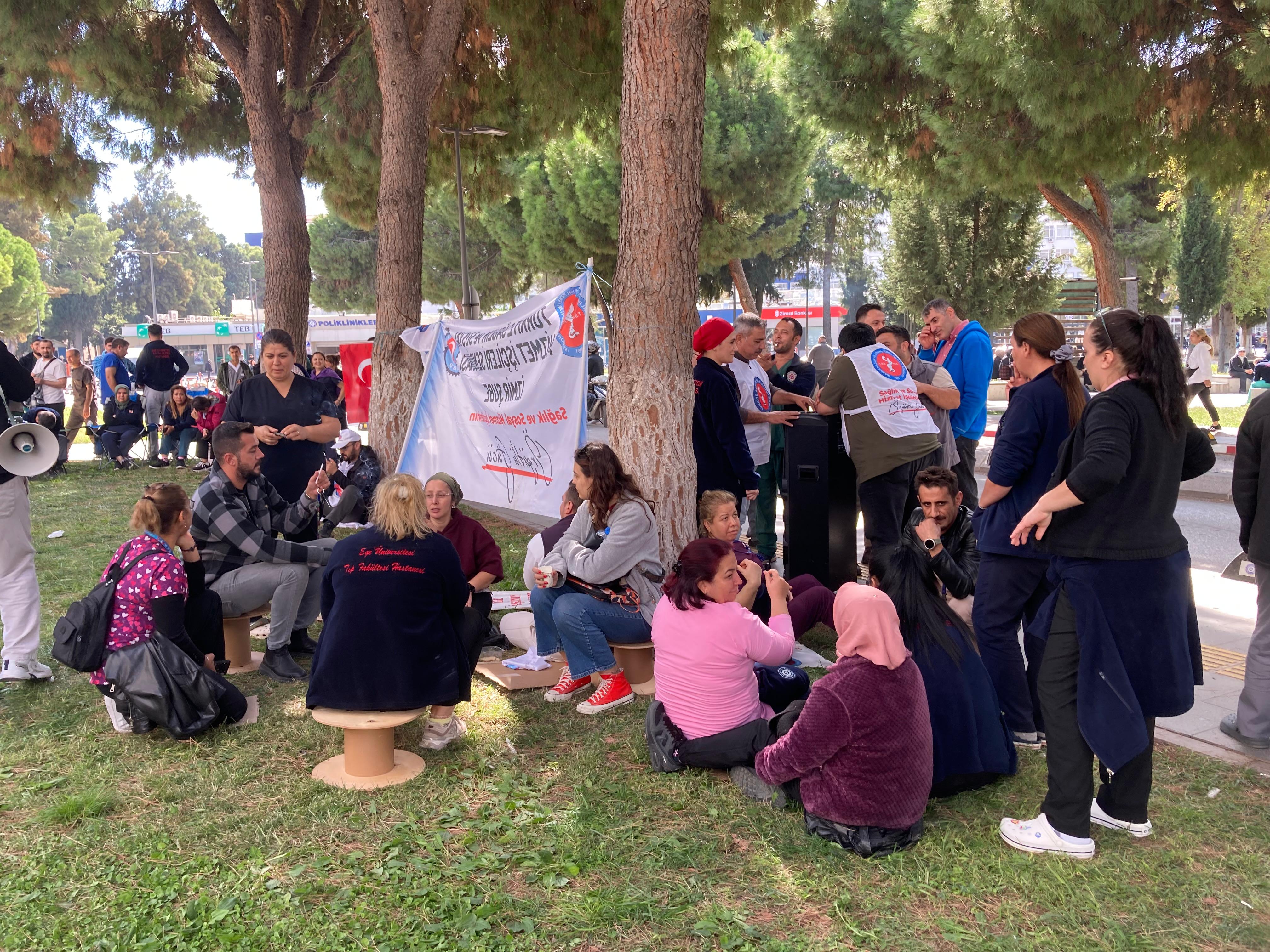 Ege Üniversitesi çalışanları bağ bulundukları Türkiye Sağlık ve Sosyal Hizmet İşçileri Sendikası İzmir Şubesi öncülüğünde hastane bahçesin eylemlerini sürdürürken hastaneye tedavi için gelen hasta yakınları tarafından da alkışlarla desteklendi.