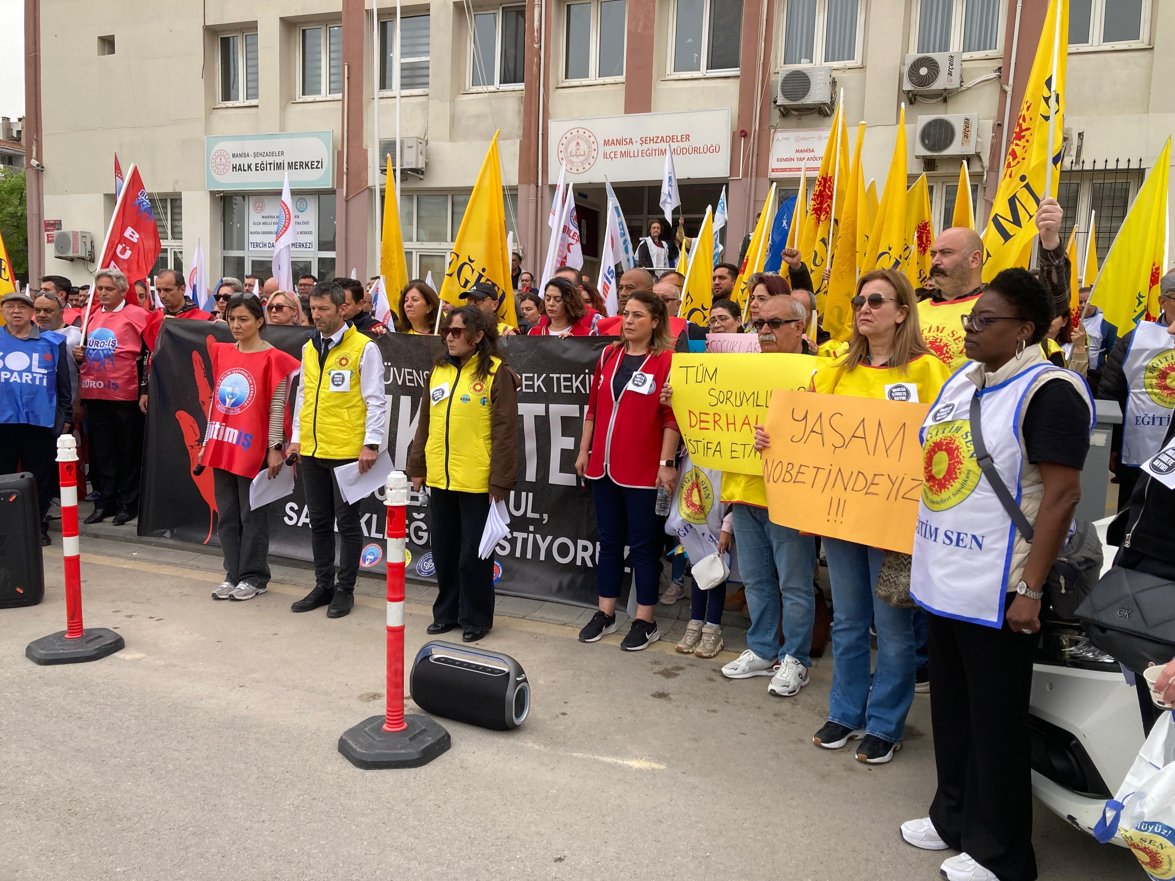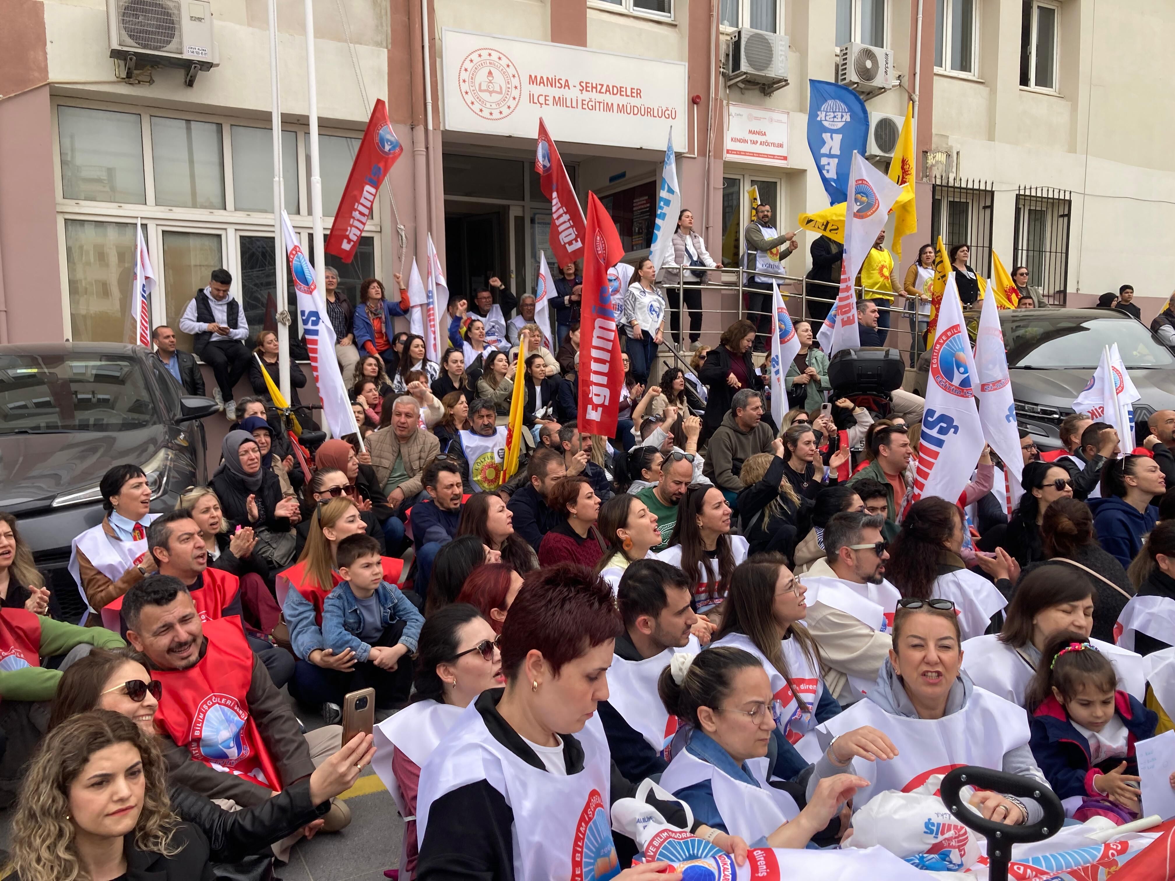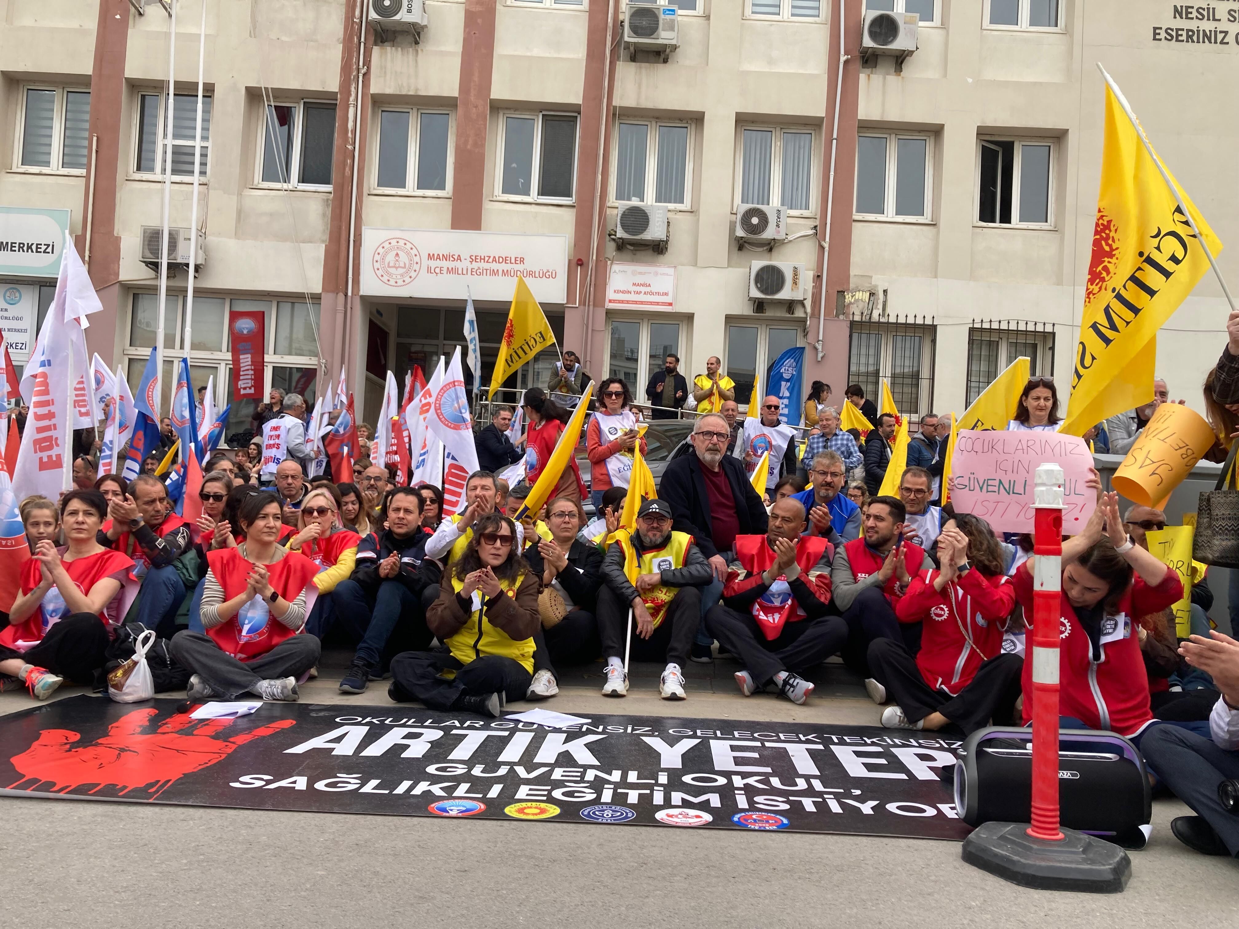Manisa’da Eğitim-Sen ve Eğitim-İş öncülüğünde bir araya gelen yüzlerce öğretmen, Şehzadeler İlçe Milli Eğitim Müdürlüğü önünde toplandı. Siyasi parti temsilcileri, sendika yöneticileri ve çok sayıda eğitimcinin katıldığı eylemde duygusal anlar yaşandı. Bazı öğretmenlerin eyleme çocuklarıyla birlikte katılması dikkat çekerken, Milli Eğitim Müdürlüğü çalışanları da pencerelere çıkarak alkışlarla meslektaşlarına destek verdi.