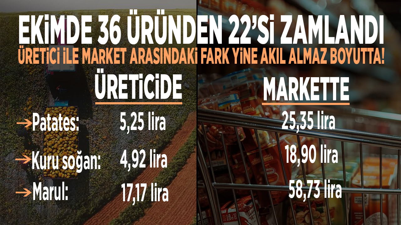 Türkiye Ziraat Odaları Birliği (TZOB) Genel Başkanı Şemsi Bayraktar, ekim ayı üretici ve market fiyatlarını değerlendirdi. Buna göre, ekimde markette 36 ürünün 22’sinde fiyat artışı, 14’ünde ise düşüş görüldü.
