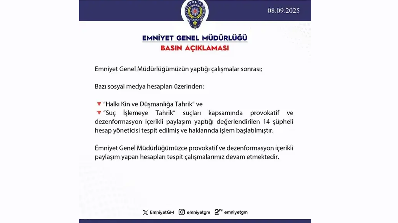 EGM'nin açıklamasında, 'provokatif' ve 'dezenformasyon içerikli' 14 hesap sahibi ve yöneticisinin tespit edildiği belirtildi.
