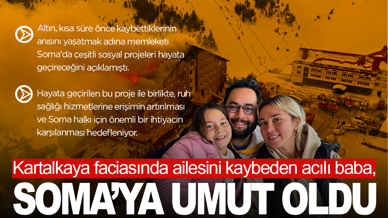 Bolu Kartalkaya Kayak Merkezi'nde yaşanan yangında eşini ve kızını kaybeden Hilmi Altın, yaşadığı büyük acıya rağmen topluma fayda sağlayacak projelere öncülük etmeyi sürdürüyor. Altın, kısa süre önce kaybettiklerinin anısını yaşatmak adına memleketi Soma'da çeşitli sosyal projeleri hayata geçireceğini açıklamıştı.